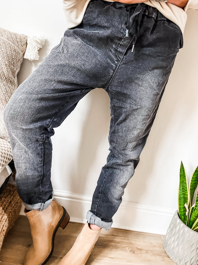 - Denim Magic Pants: The perfect more comfortable replacement to jeans. The stretchy material is designed in a tapered leg with a drawstring waistband to achieve the perfect fit.