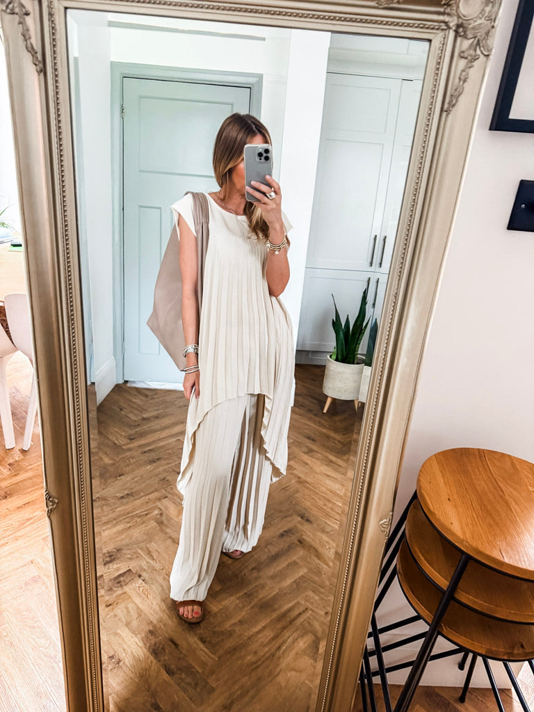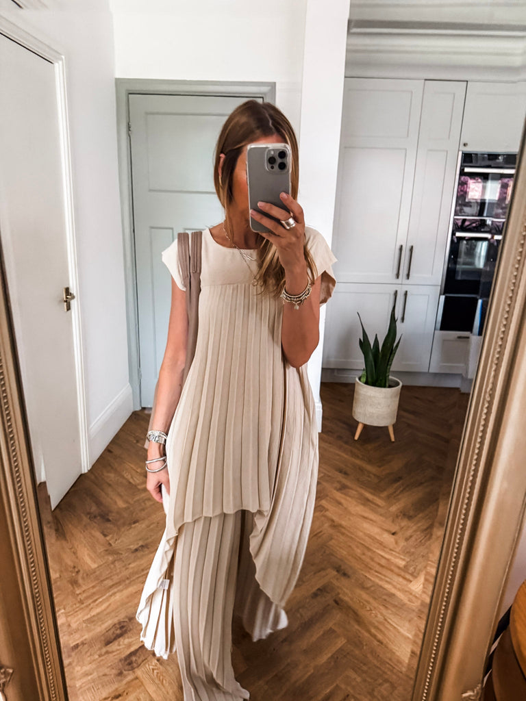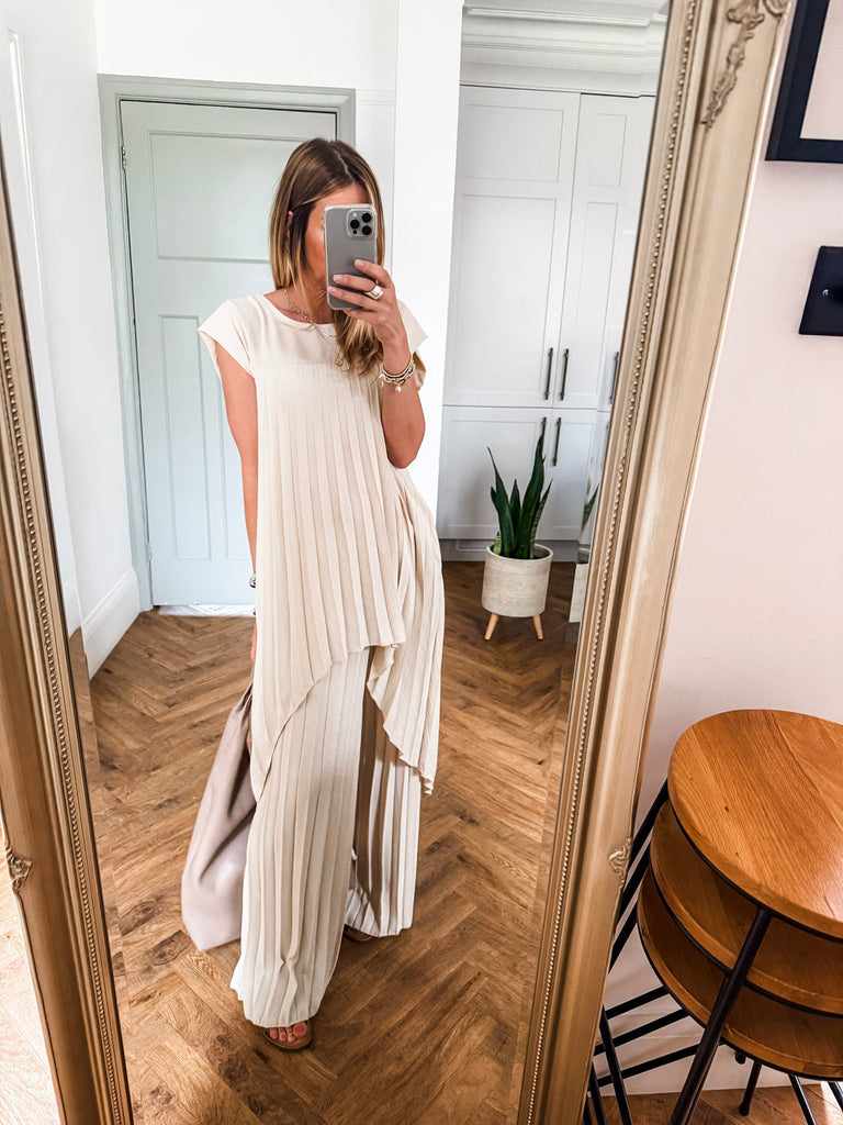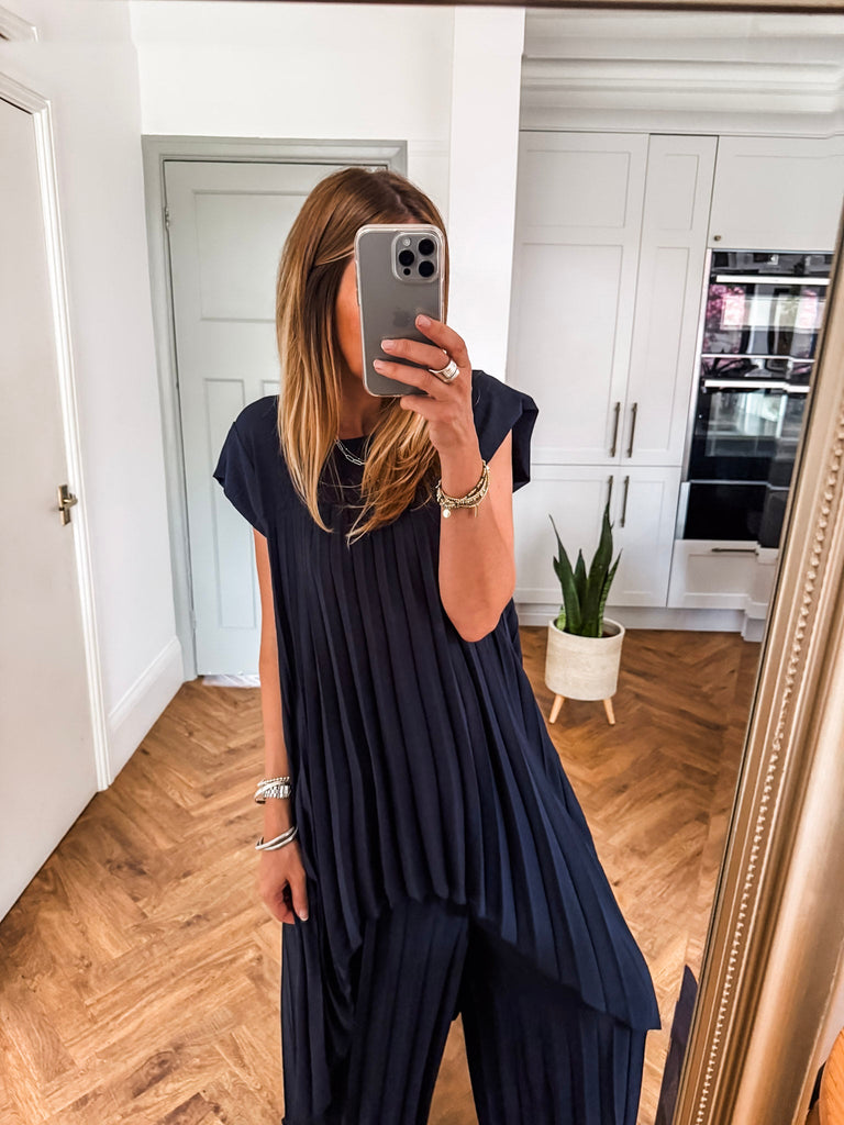 This pleated co-ord set combines modern design with everyday comfort, featuring a relaxed top with a curved high-low hem and easy short sleeves. The elasticated waist and practical pockets add function without sacrificing style. Finished with full-length trousers, it’s a polished, go-anywhere look made for effortless dressing.