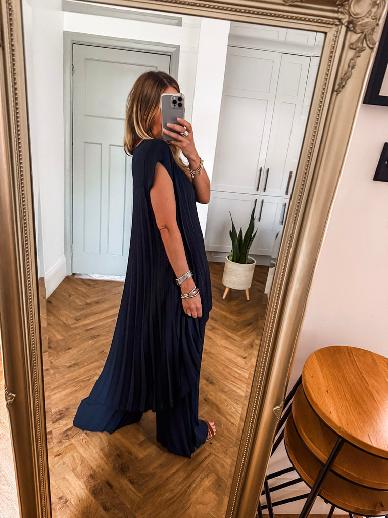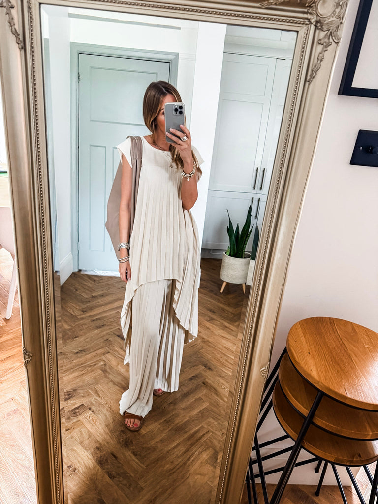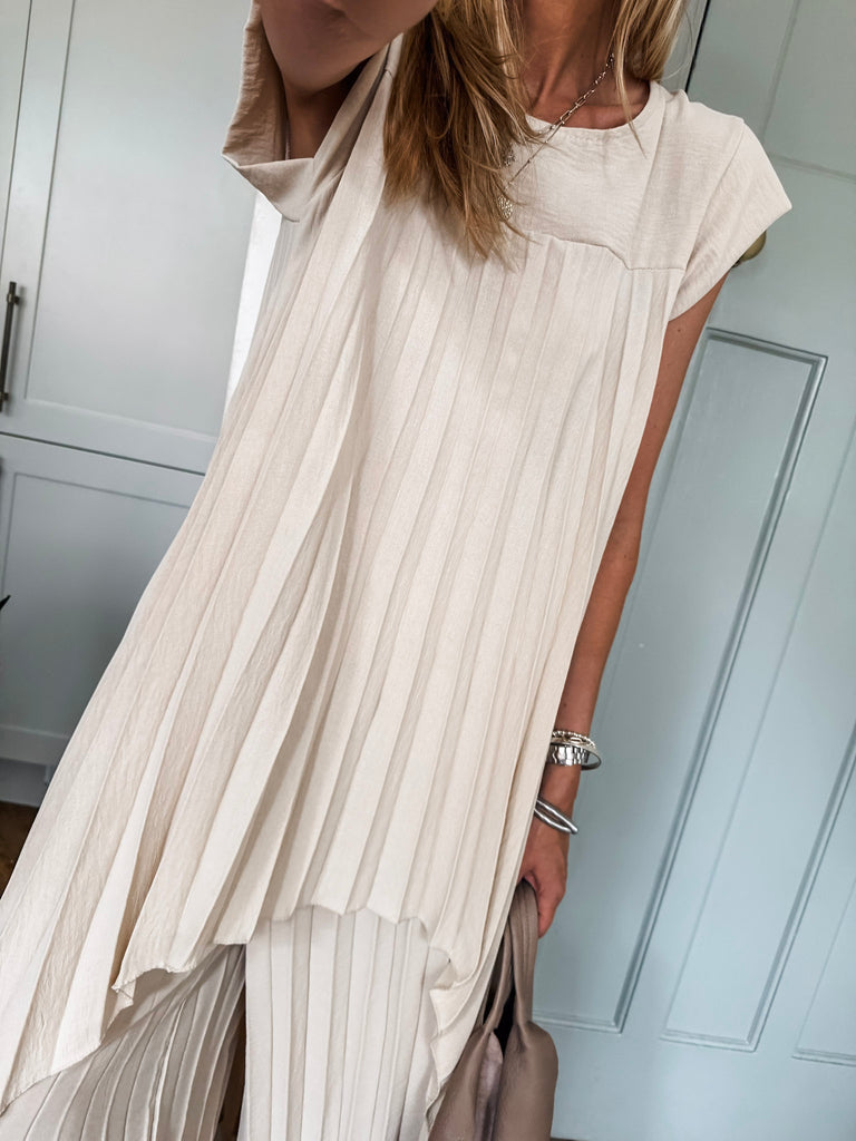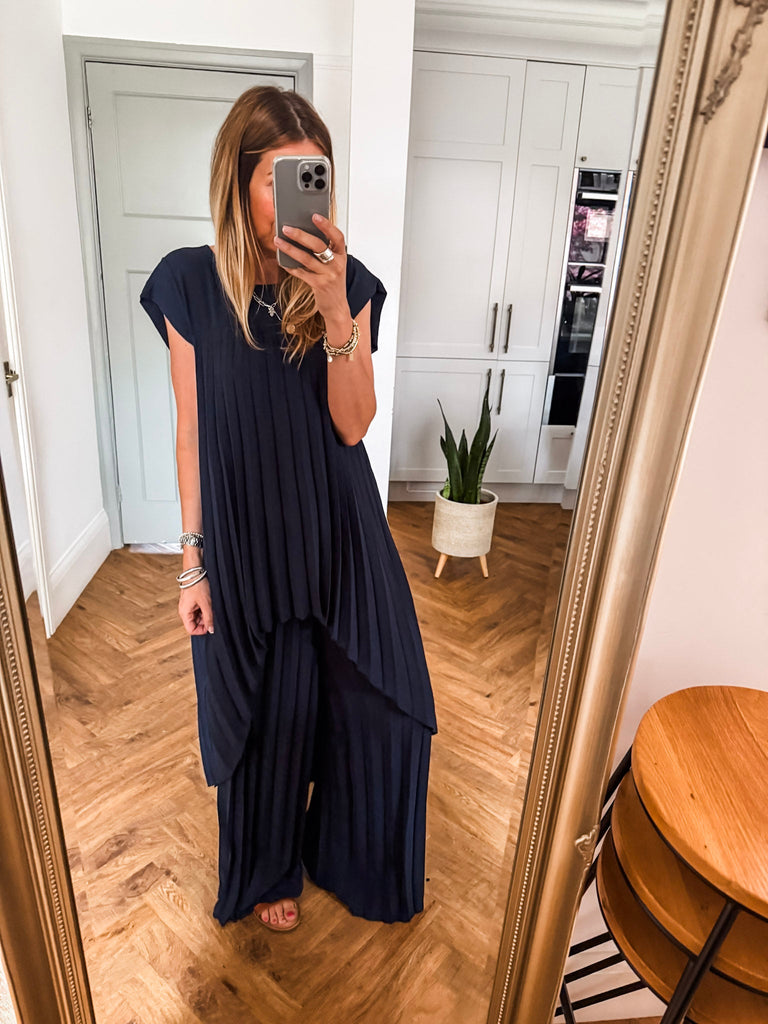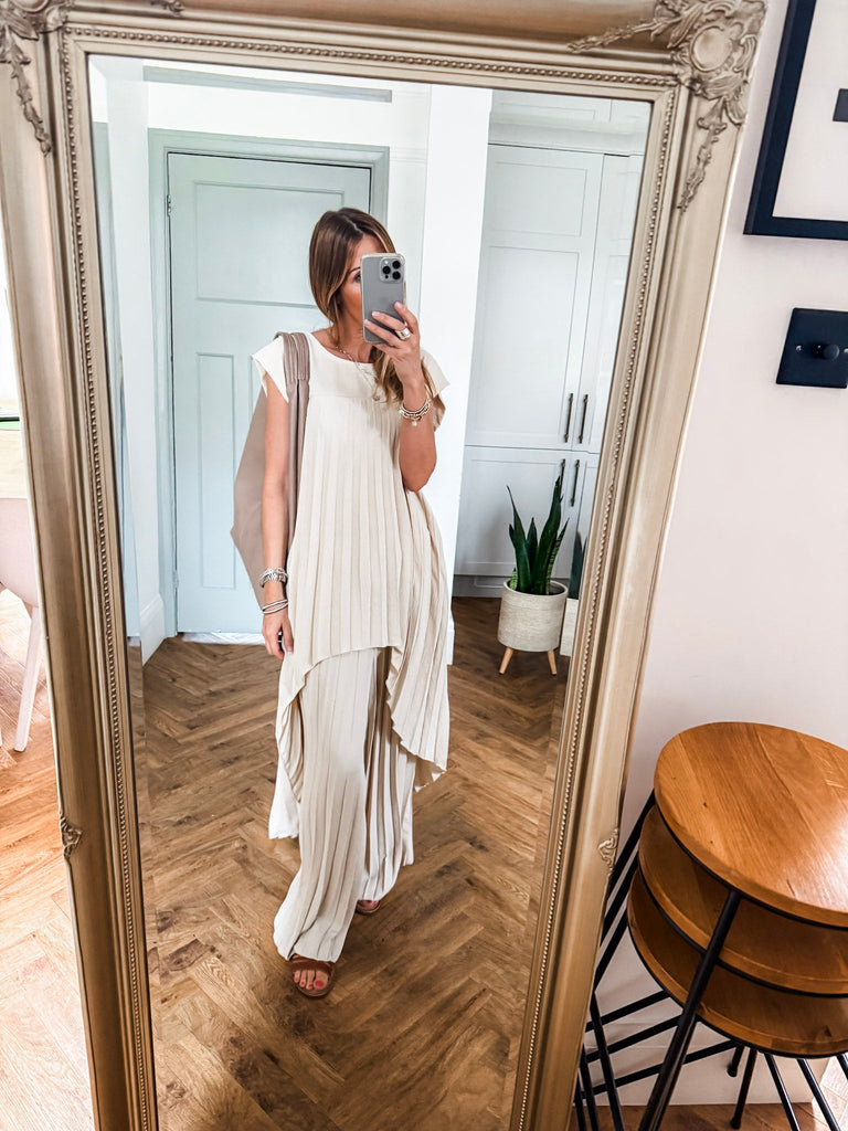 This pleated co-ord set combines modern design with everyday comfort, featuring a relaxed top with a curved high-low hem and easy short sleeves. The elasticated waist and practical pockets add function without sacrificing style. Finished with full-length trousers, it’s a polished, go-anywhere look made for effortless dressing.