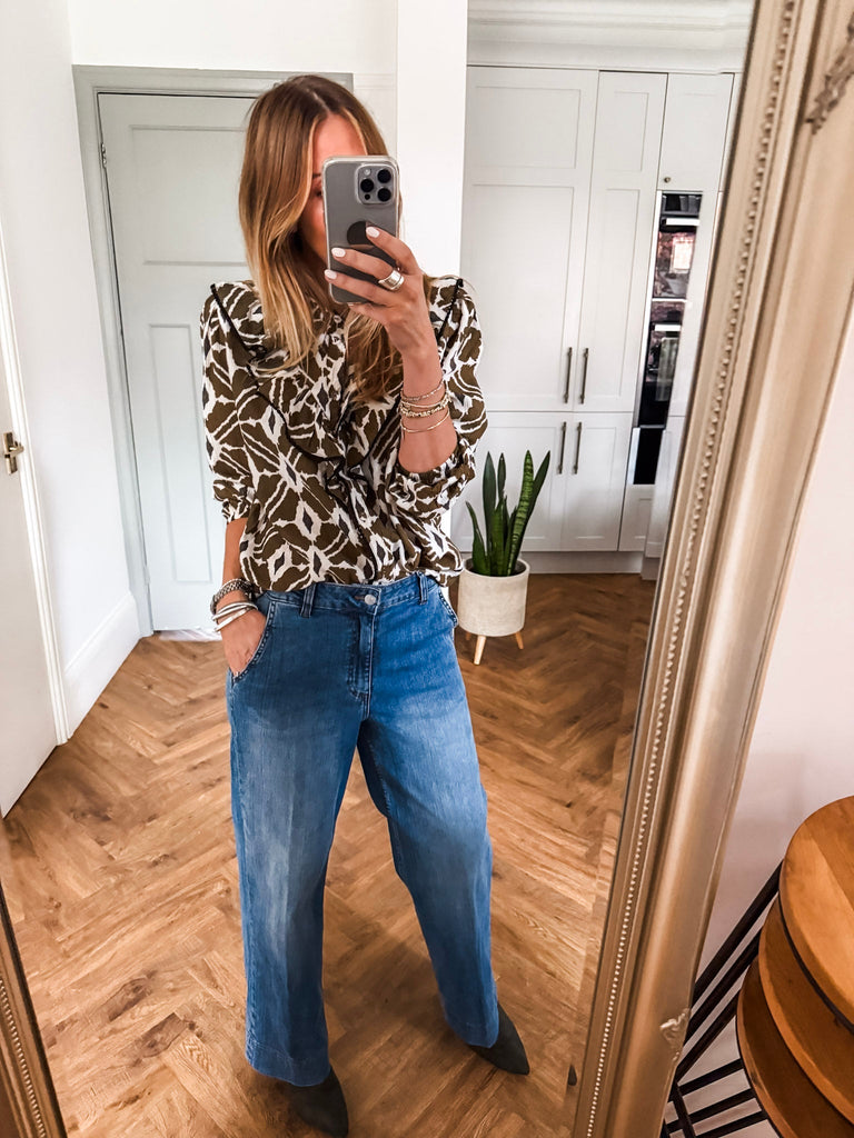 Style the Inaba Frill Shirt with high-waisted jeans and ankle boots for an elevated everyday look. Layer it under a tailored blazer for a touch of feminine charm at work. For evenings out, pair with a sleek skirt and statement earrings to let the print shine.