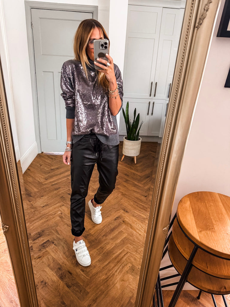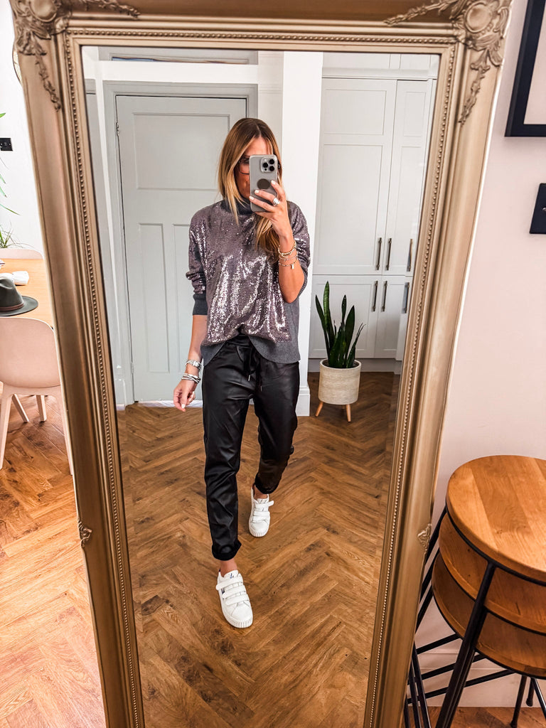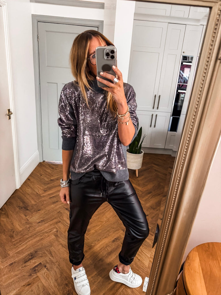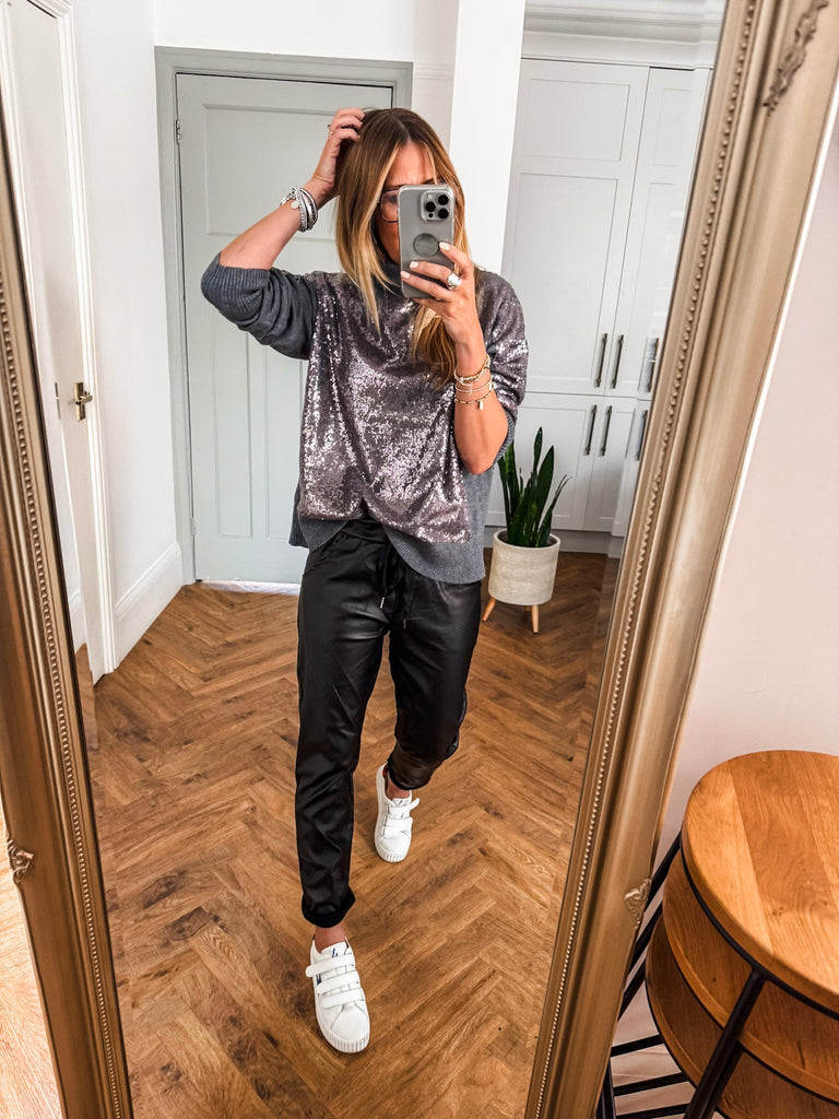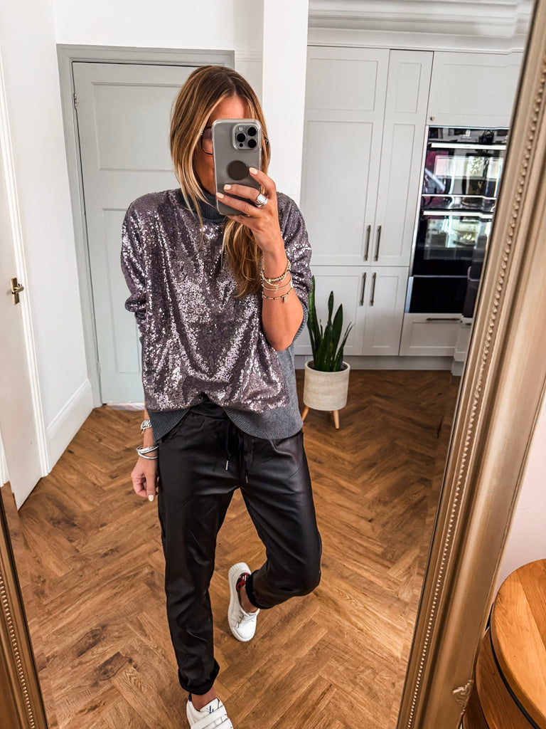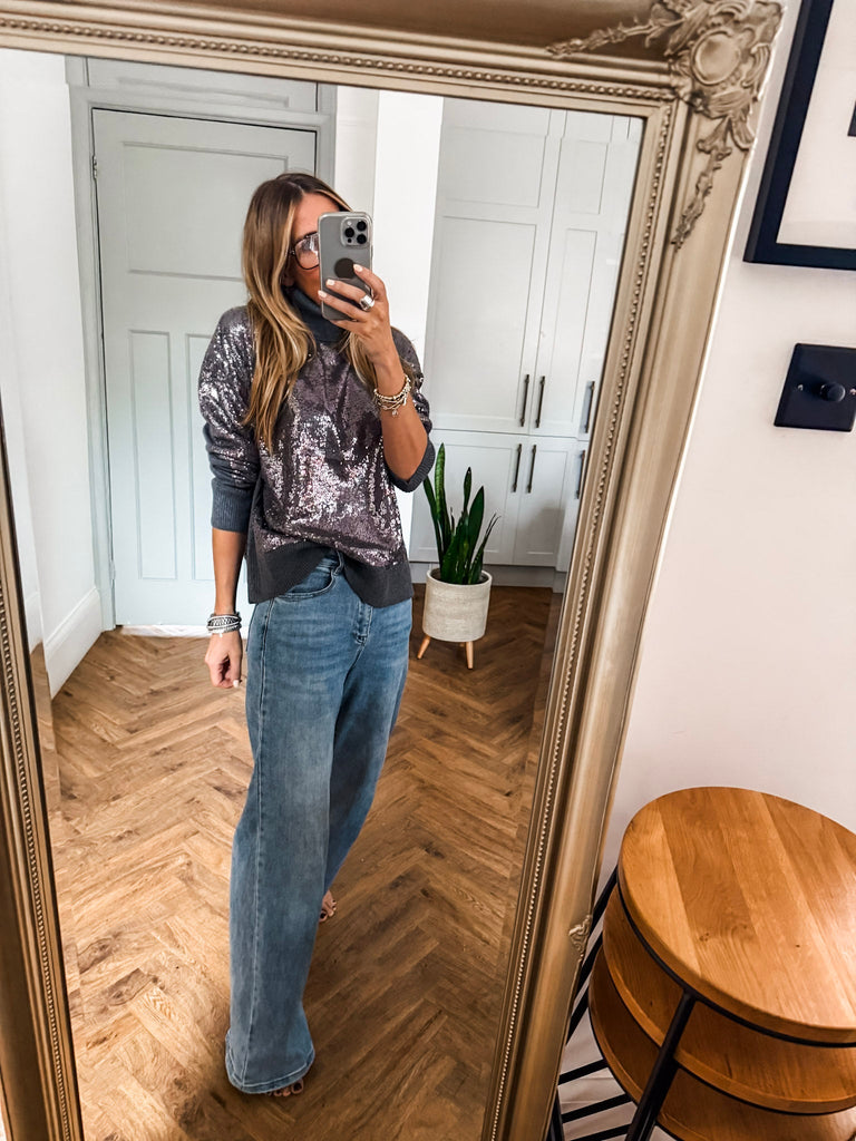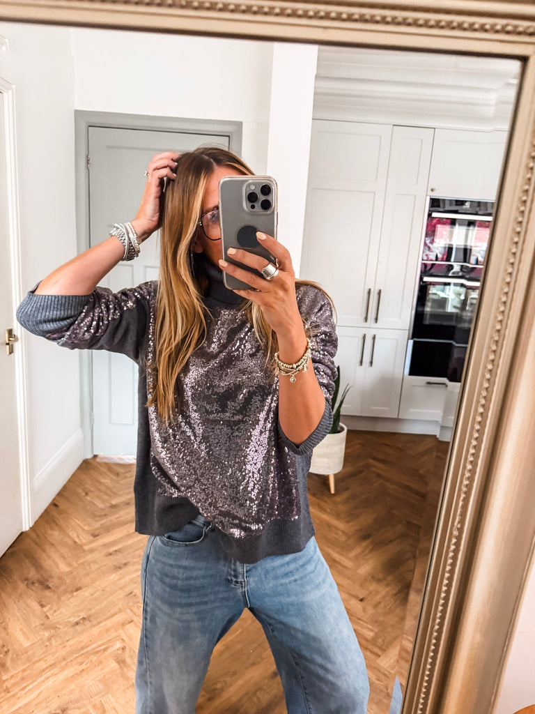 The Hailey Turtleneck is a wool mix jumper in grey featuring a sequin-covered front and back for a touch of sparkle. With long sleeves, a cozy turtleneck, and an oversized fit, this hip-length piece transitions effortlessly from day to evening, adding a chic, eye-catching element to any outfit.