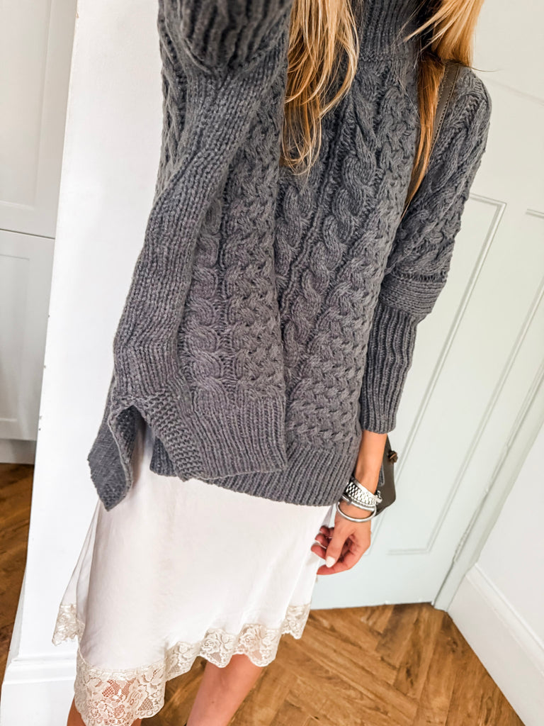 Wrap yourself in effortless style with our Cable Turtle Neck Long Jumper — a modern essential for cooler days. Its oversized knit, extended length, and cozy roll neck deliver warmth with a contemporary edge. Finished with cable/ribbed details for a snug, textured fit that’s perfect solo or layered.