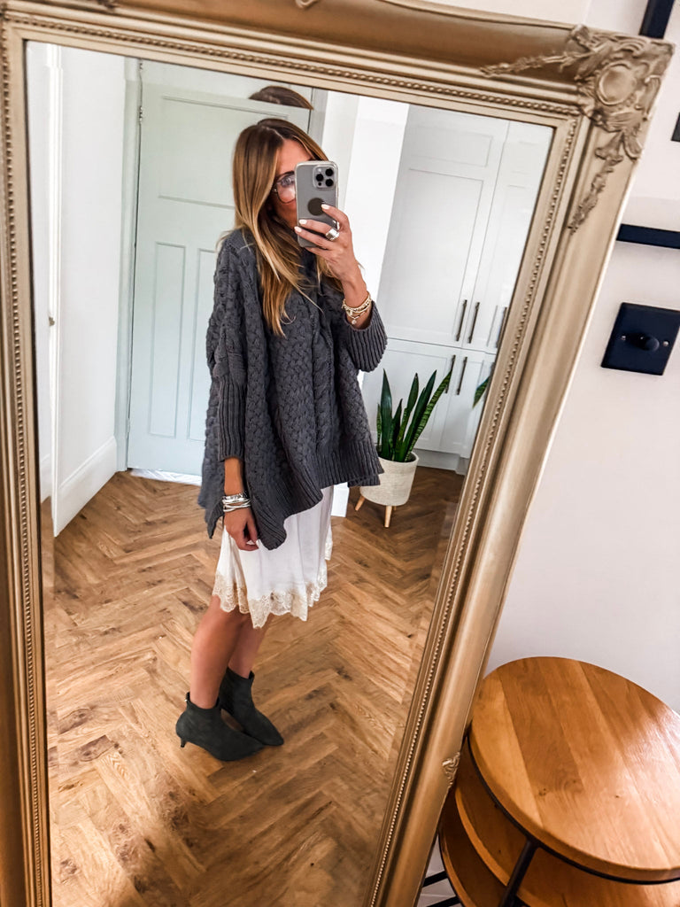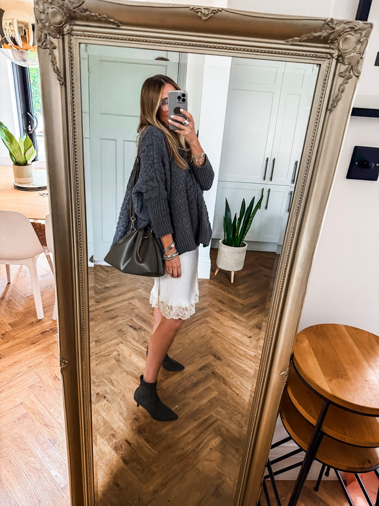 Style it with wide-leg trousers and chunky boots for a relaxed, street-ready look. Layer over a midi skirt and tights for a cozy yet elevated outfit. Add a structured coat and statement accessories to take it from day to night effortlessly.