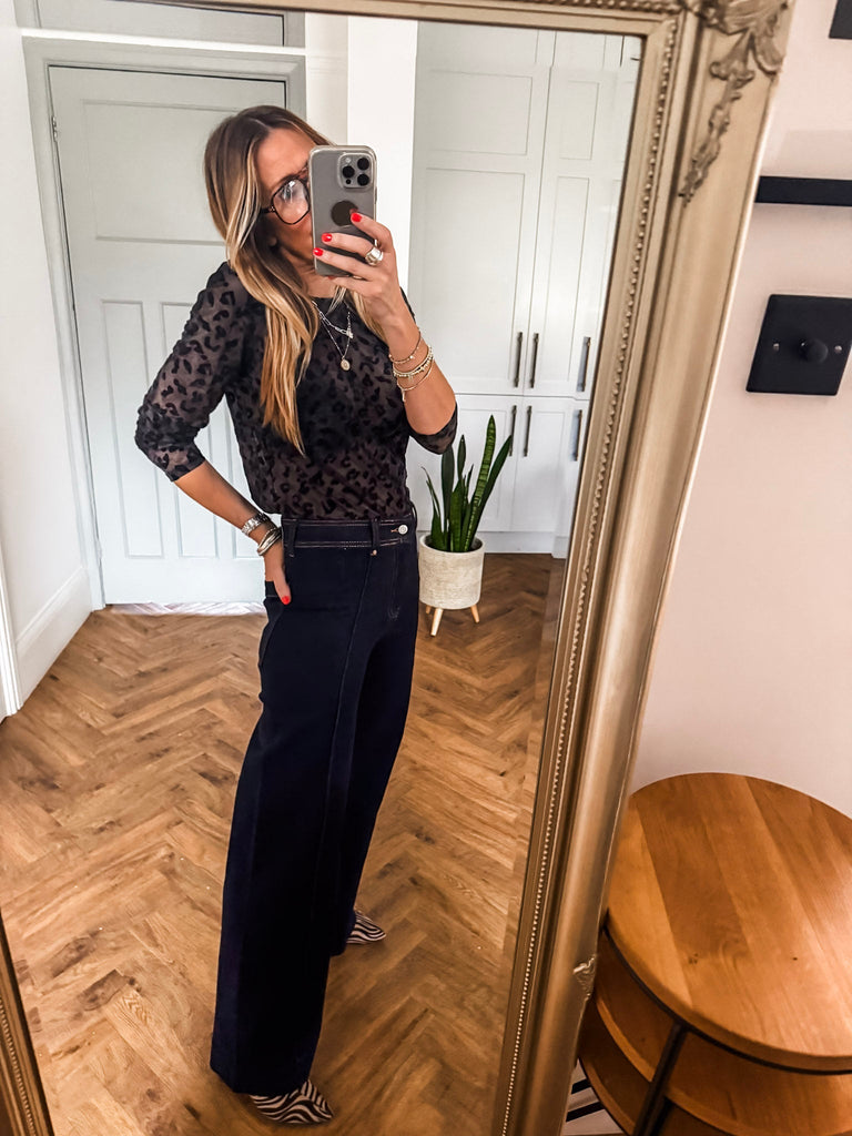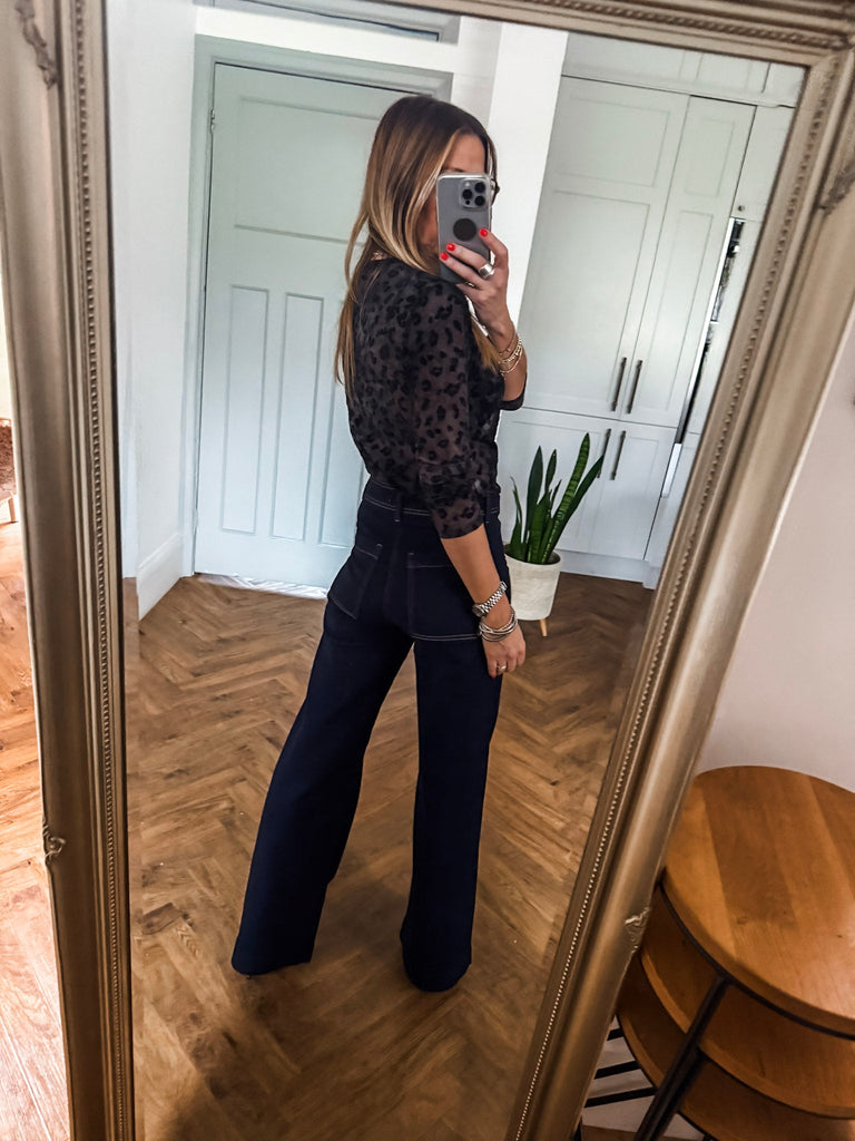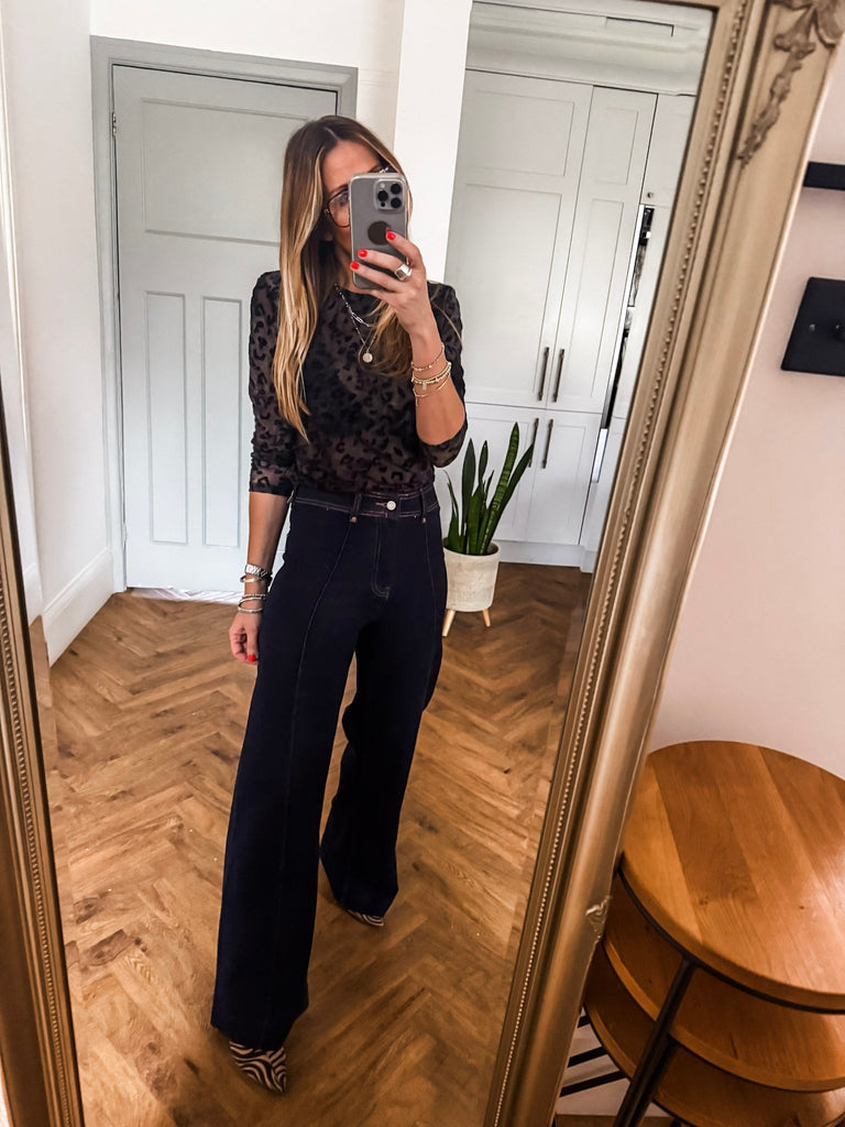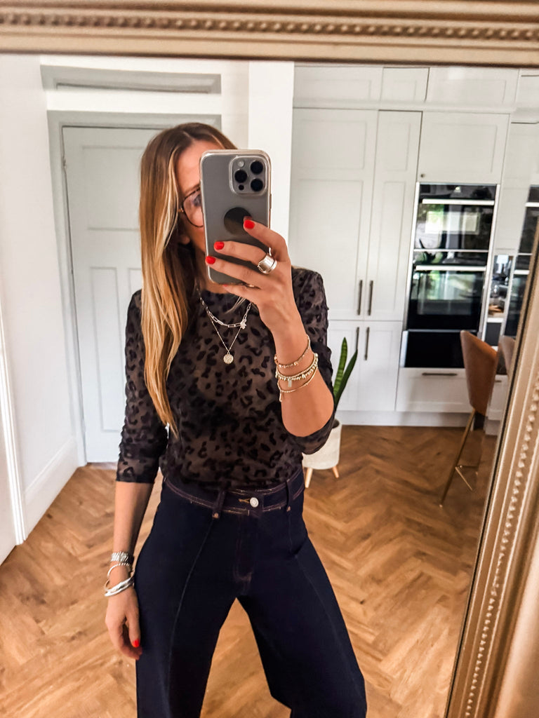 Unleash your wild side with the Leopard Print Mesh Top, featuring a soft velvet print on breathable mesh for an effortlessly edgy look. With long sleeves and a sleek fit, it blends comfort and style seamlessly. Perfect for layering or making a bold statement on its own. Gorgeous with our jeans and wid leg trousers.