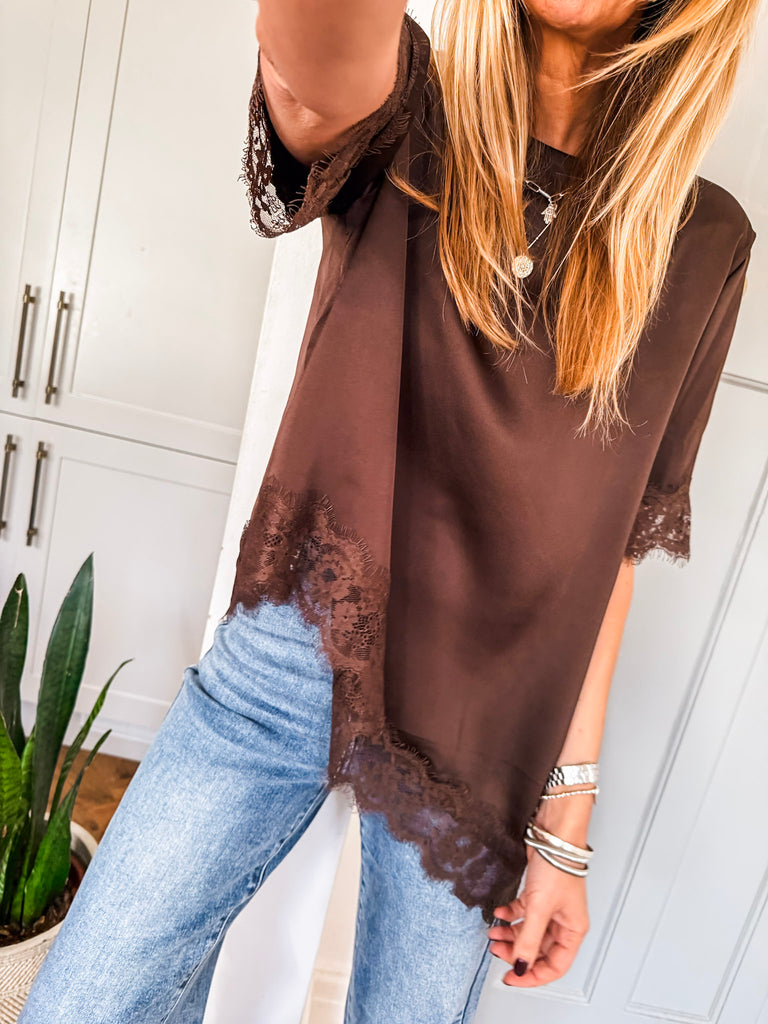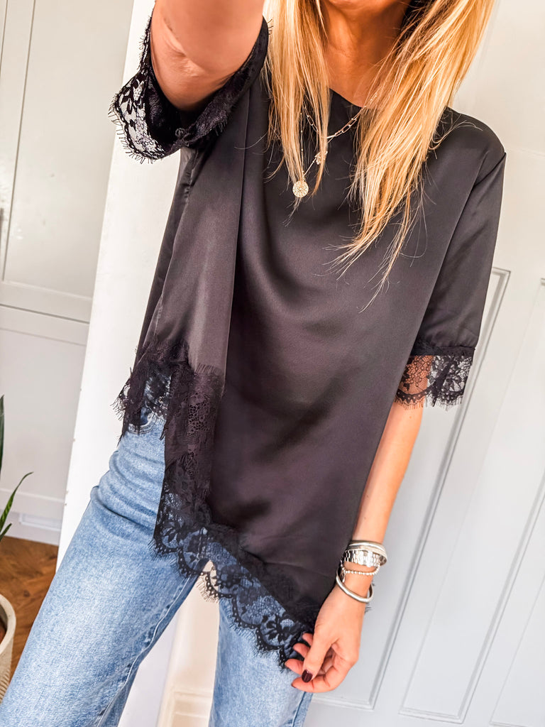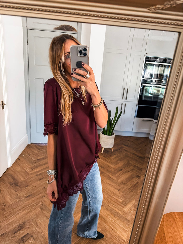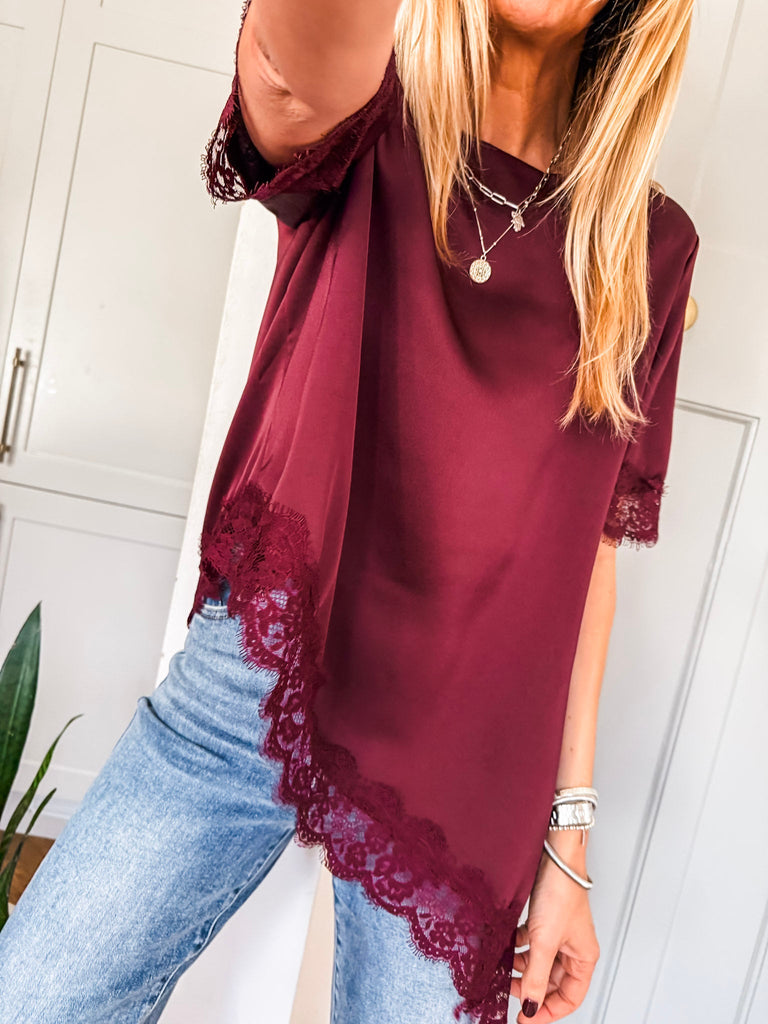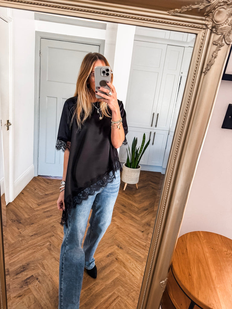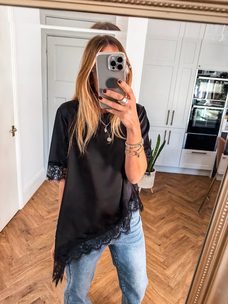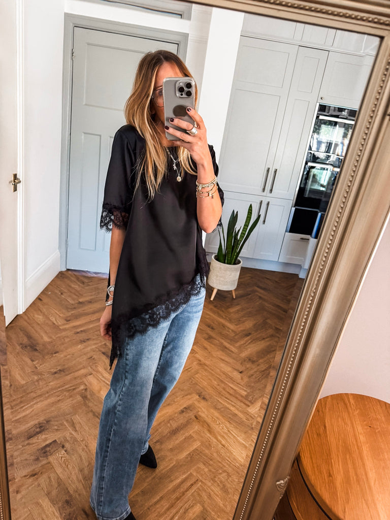 Asymmetric Lace Trim Satin Top