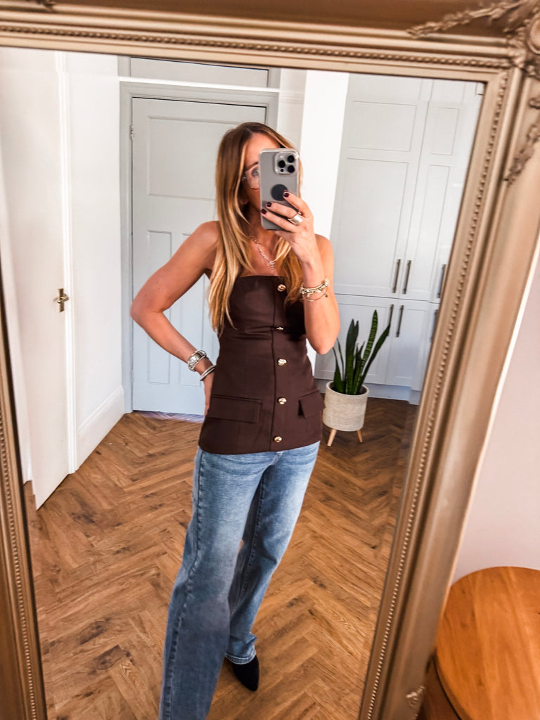 Turn heads in this Bandeu Gold Button Top —effortlessly chic with a flattering shape and gorgeous fit. Designed for going out with a modern edge. It’s your go-to piece for easy, standout style on any occasion. Suit style with pockets.