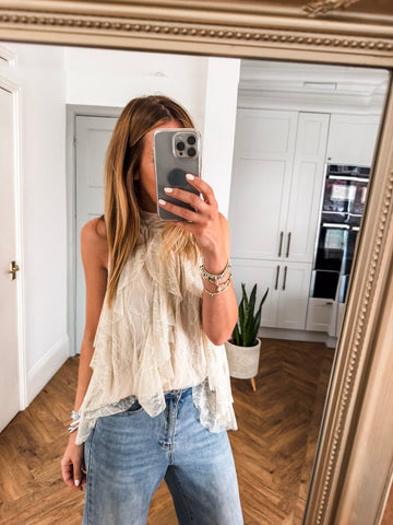 Add a lace, artistic edge to your autumn look with this sleeveless halter top, featuring playful ruffles and a striking lace fabric Lightweight and breezy, it’s made for going out and standout moments. Effortlessly cool, it’s your go-to for turning heads with ease.