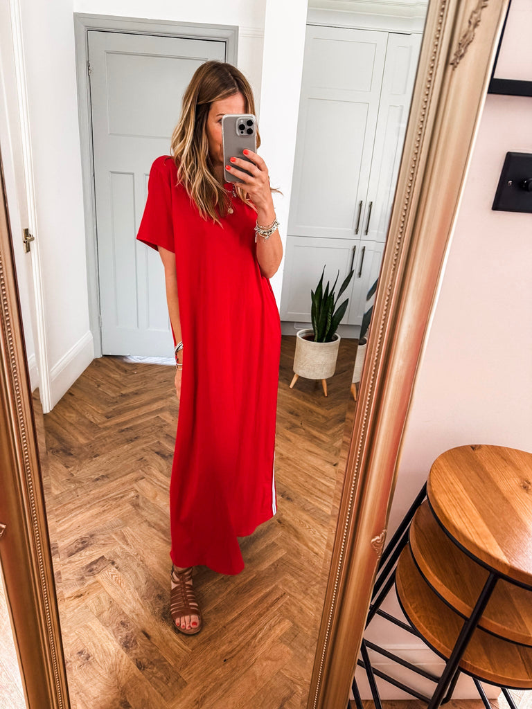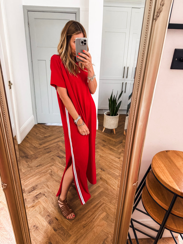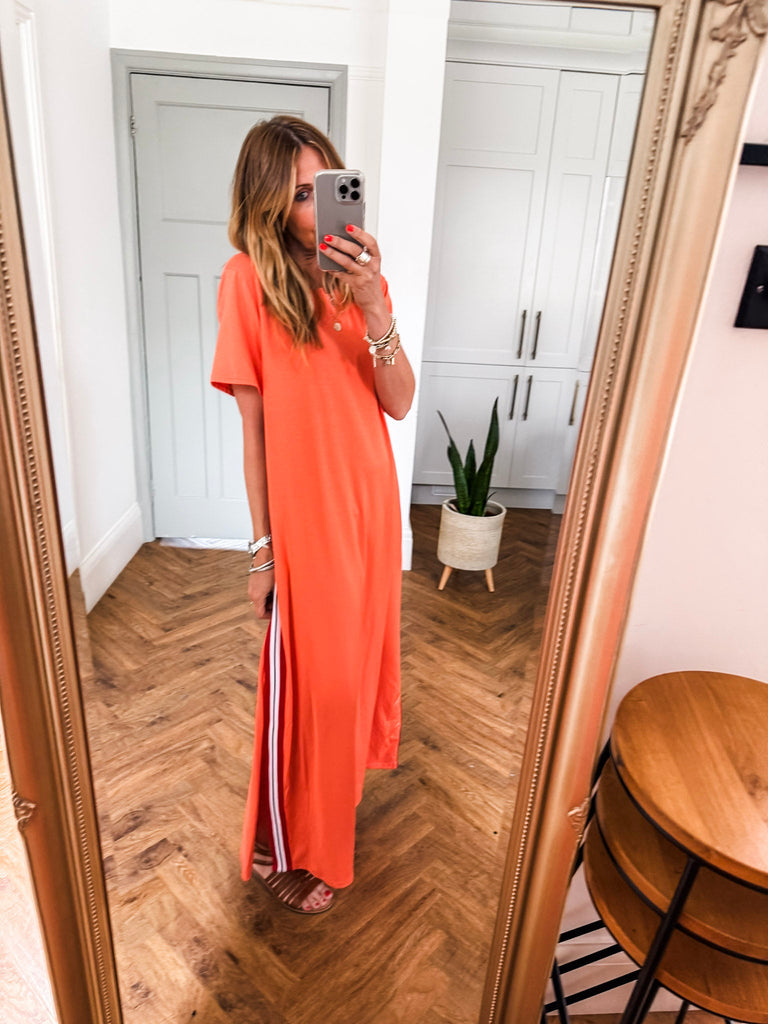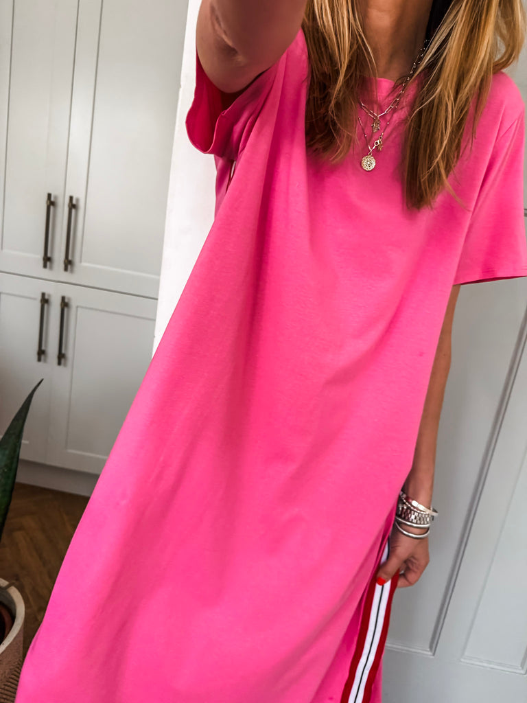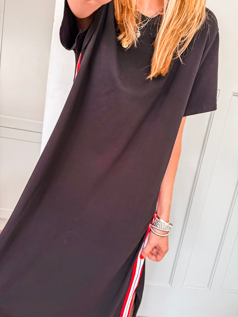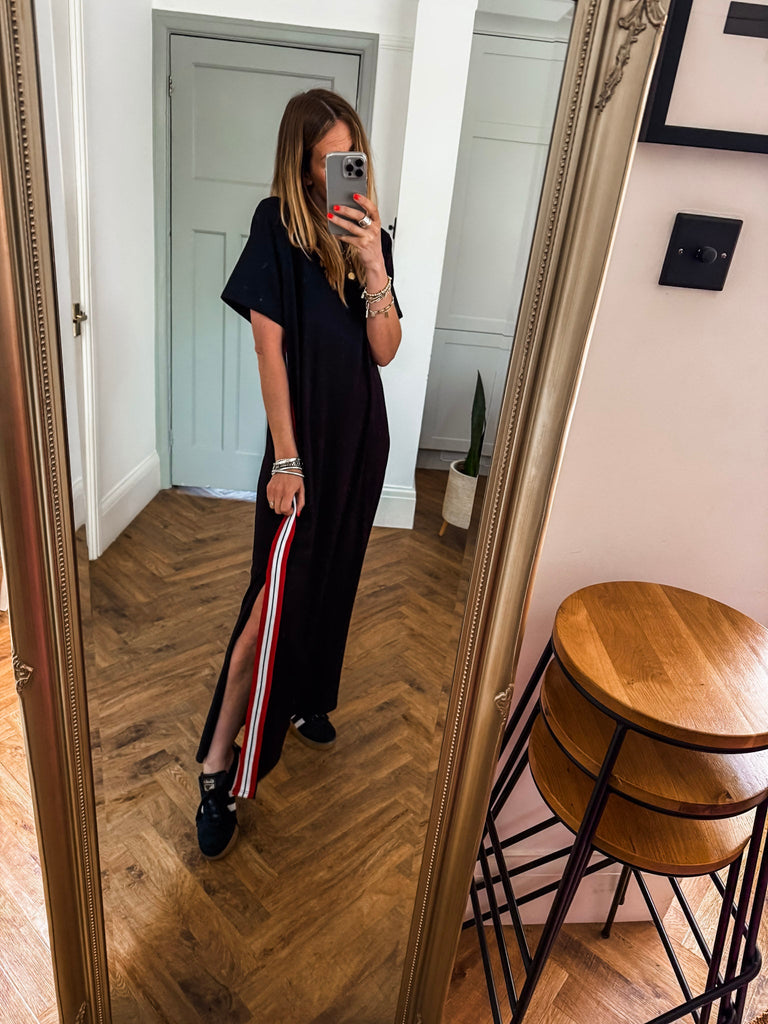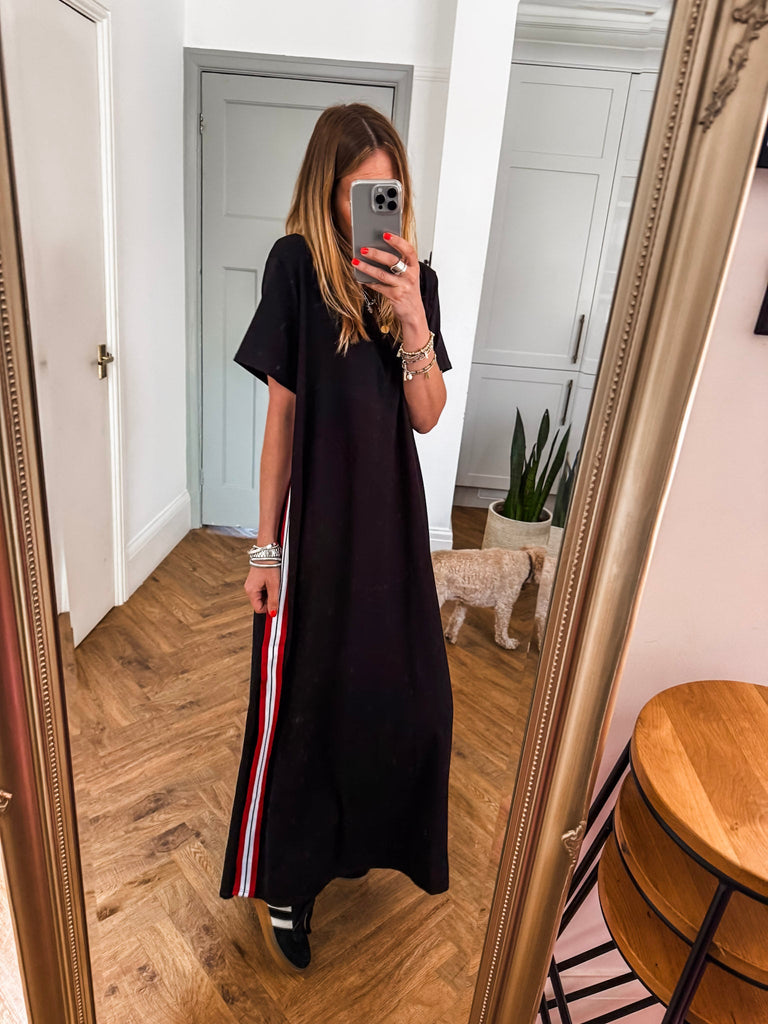 Step into effortless style with the Maxi Side Stripe Jersey Dress—casual, cool, and ultra-comfortable. The sleek side stripe adds a sporty edge, while the soft jersey fabric, short sleeves, and maxi length keep it laid-back yet refined. A versatile go-to for easy everyday dressing.
