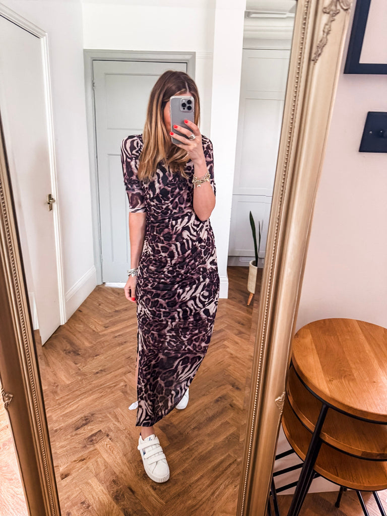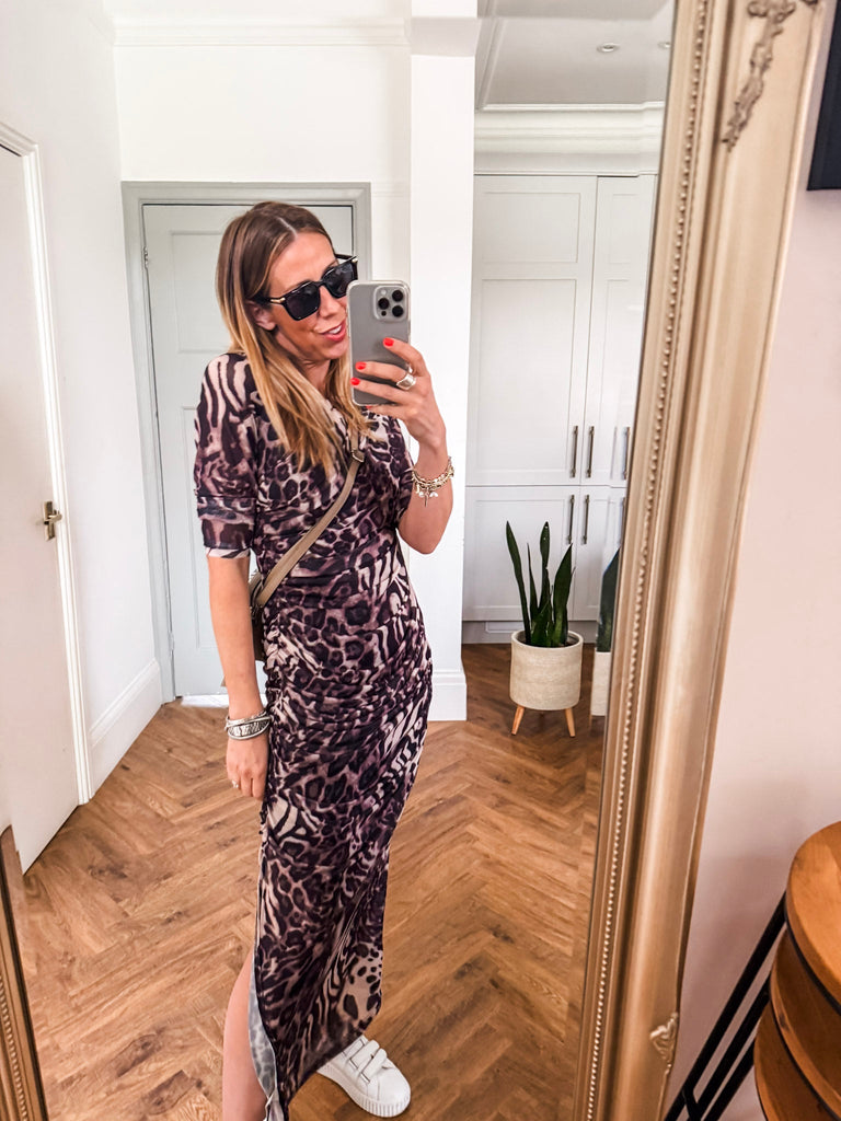 This is going to be a favourite!!!! Make a bold statement in our Mesh Leopard Dress, featuring a fierce leopard print and flattering ruched middle. The long sleeves and mesh fabric keep you cool while adding an edgy, yet chic touch. A must-have piece for anyone ready to stand out in style.