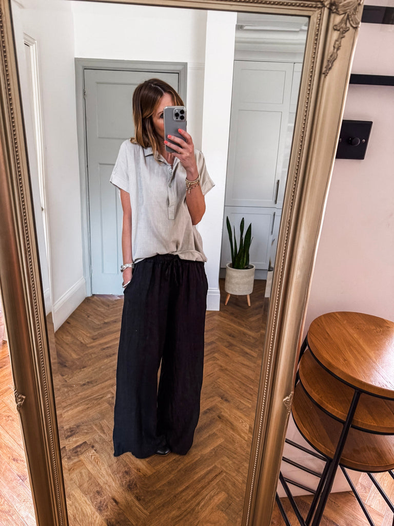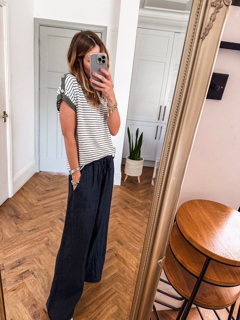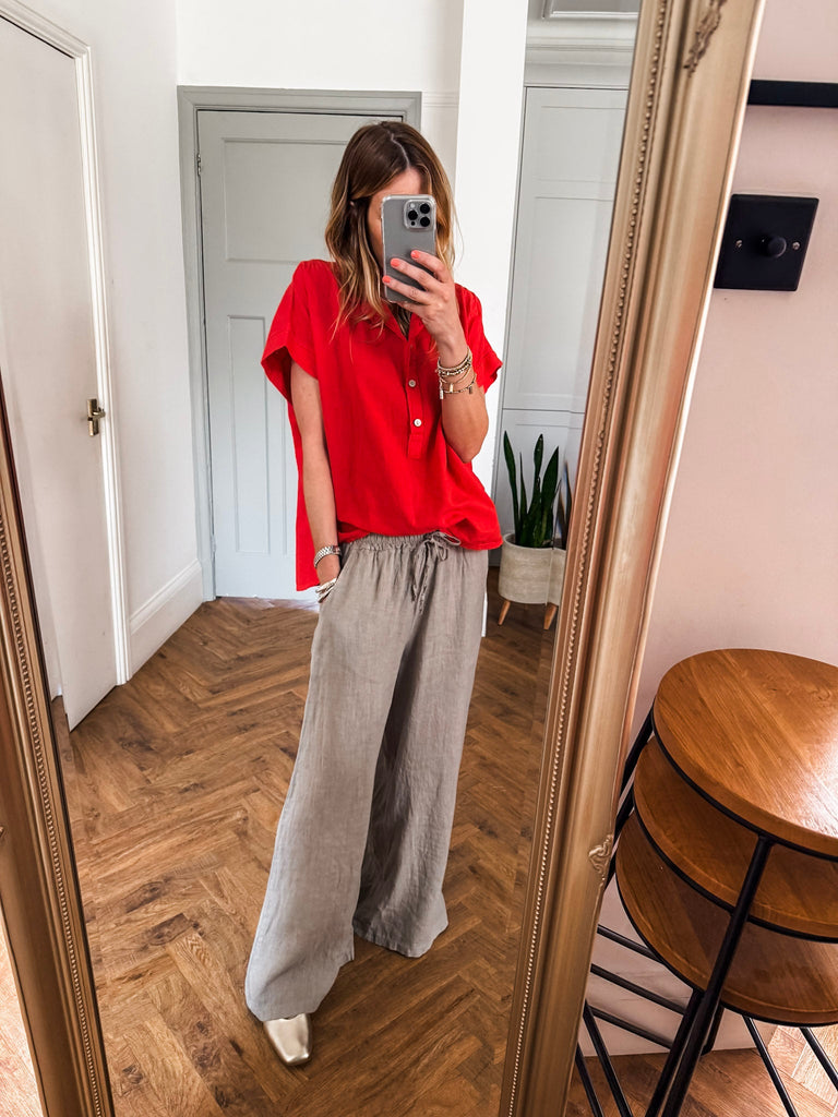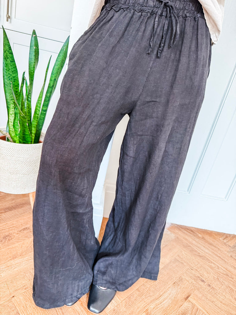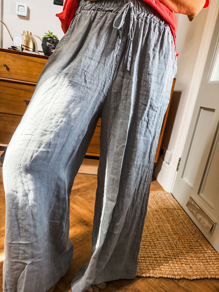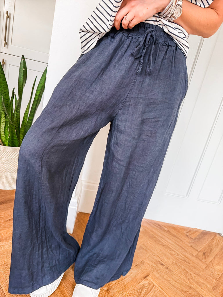 If you love our linen wide leg trousers then these are for you! Stay effortlessly stylish and cool in these breathable linen trousers, designed for all-day comfort. Featuring an elasticated waist and handy pockets, they’re perfect for laid-back outings or relaxed lounging. Style your wardrobe with this versatile blend of comfort and chic simplicity.