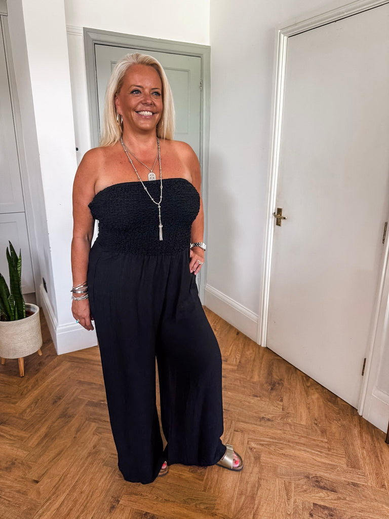 Turn heads in this Bandeau Shirred Jumpsuit—effortlessly chic with a flattering shirred bodice and flowy wide-leg fit. Designed for all-day comfort with a modern edge. It’s your go-to piece for easy, standout style on any occasion.