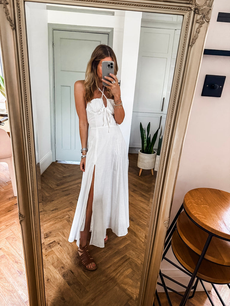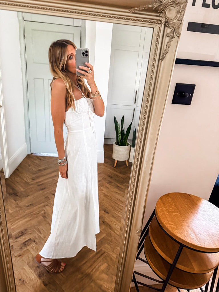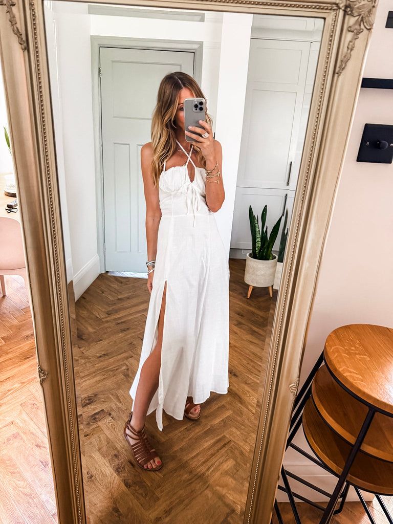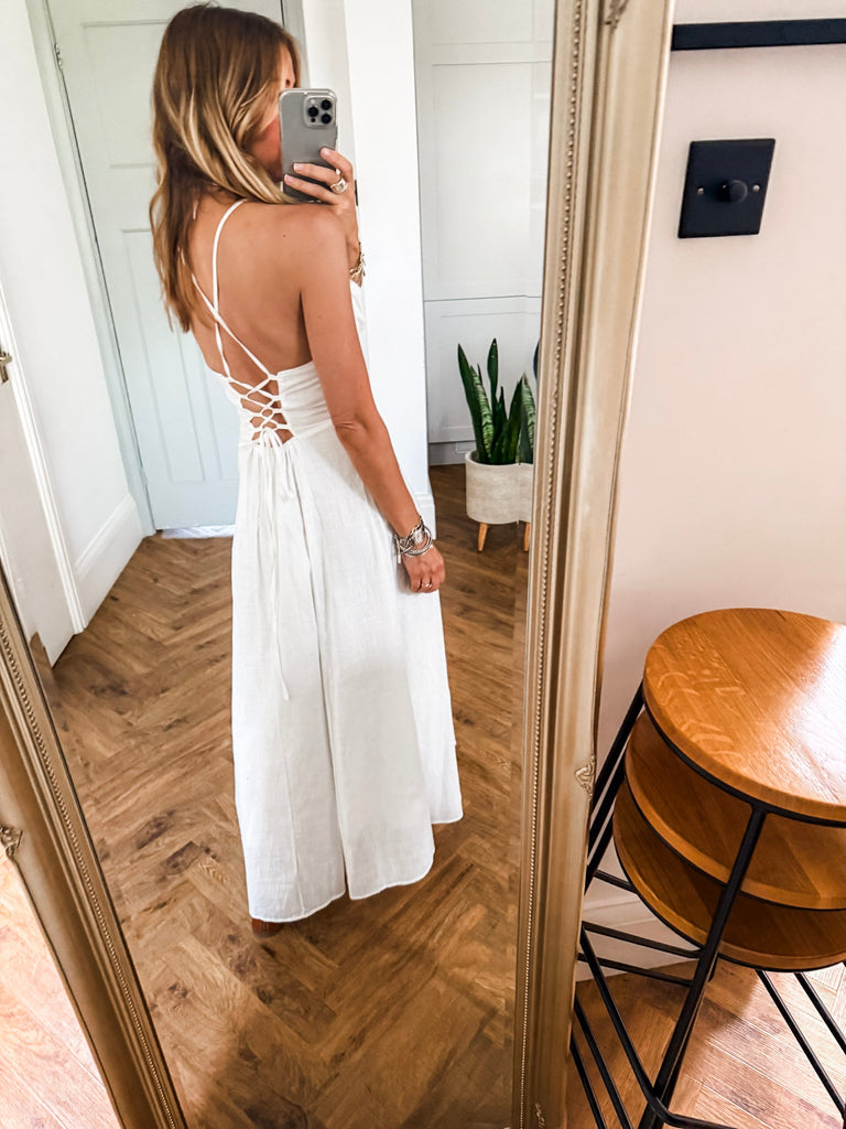Stay effortlessly chic in this cotton strappy maxi dress, designed for warm days and nights. The sleek side split and zip fastening add subtle edge and easy wearability. Perfect for laid-back elegance with a modern twist. Corset style back!