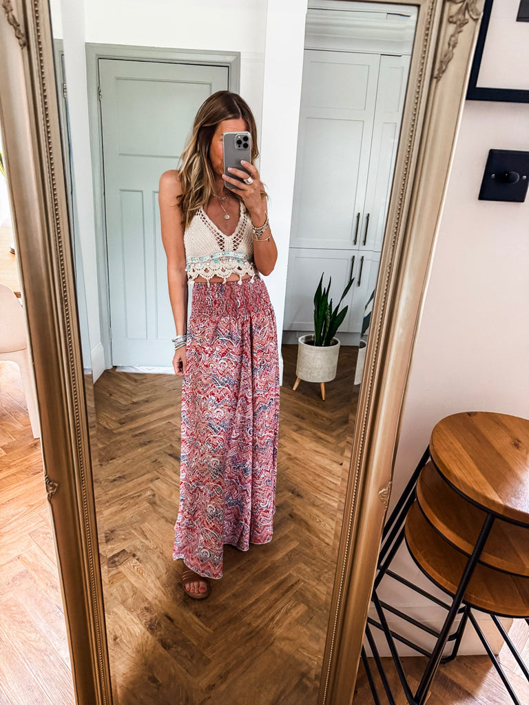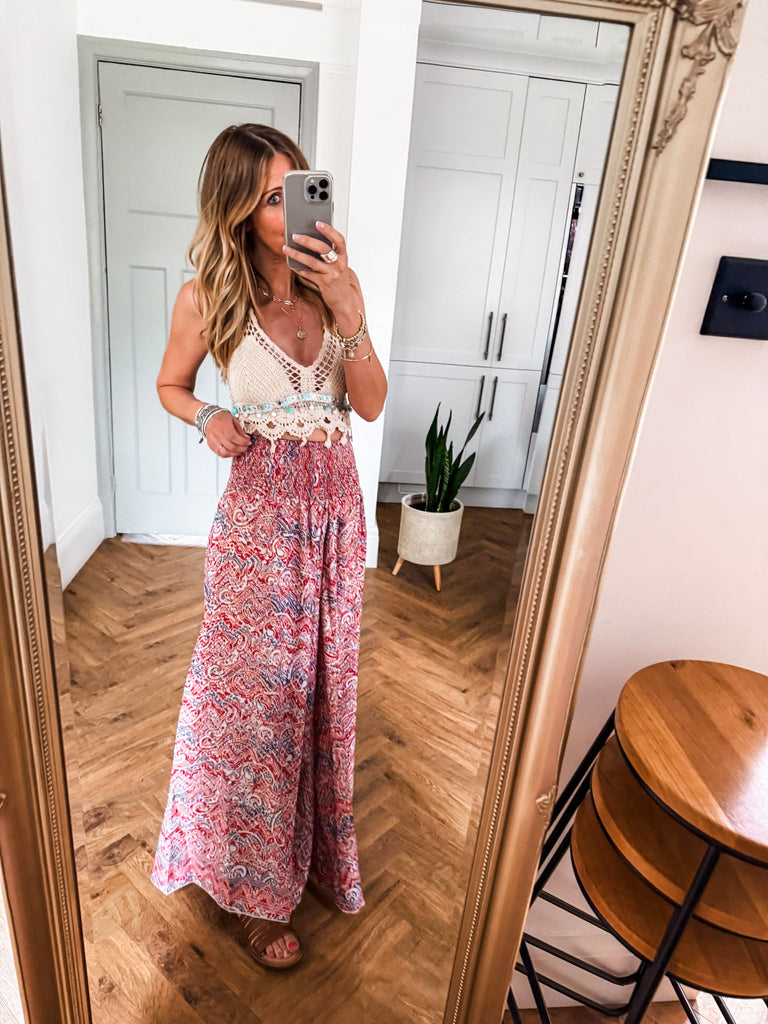 Pair it with high-waisted shorts or a flowing maxi skirt for the ultimate festival look. Layer under a sheer blouse or kimono for added texture and intrigue. Whether styled solo or layered, it’s made to turn heads.