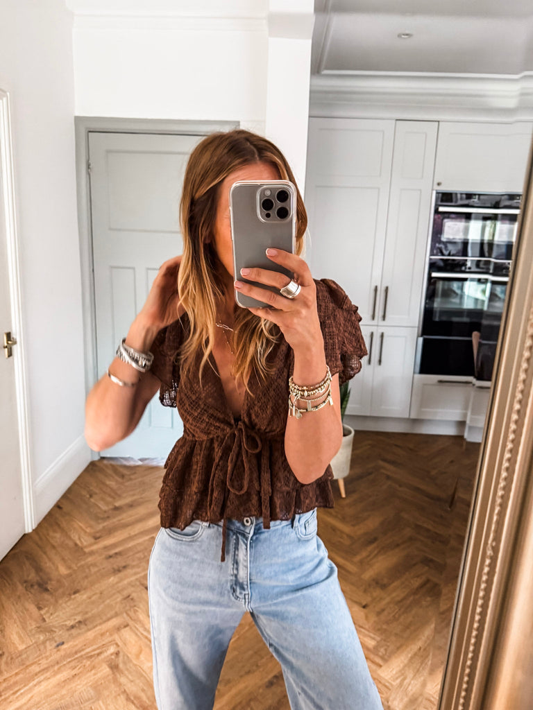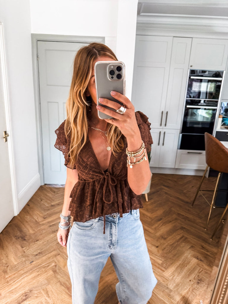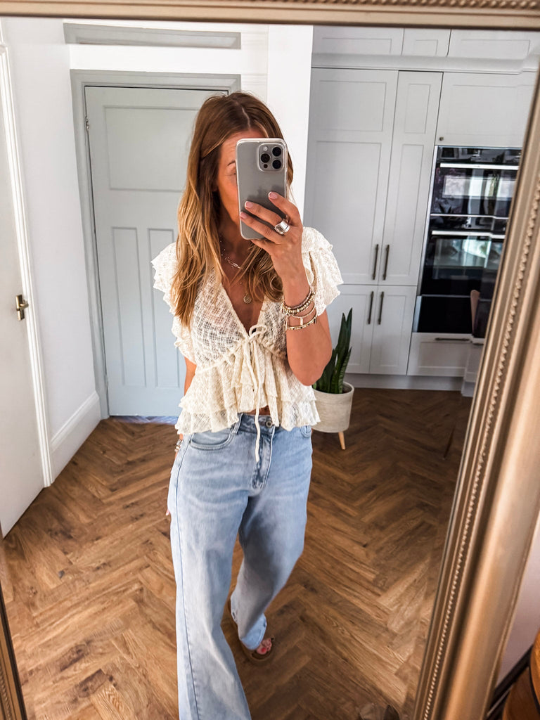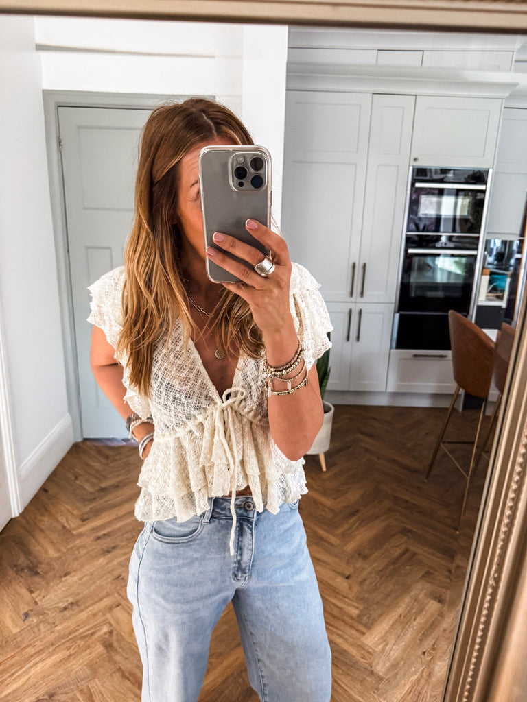 This Lace Frill Tie Top blends delicate lace with playful frill sleeves and hem for a fresh, feminine edge. The tie-front design lets you style it your way—chic and closed or relaxed and open. A versatile piece made for effortlessly cool looks.