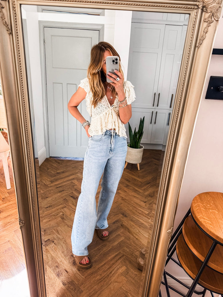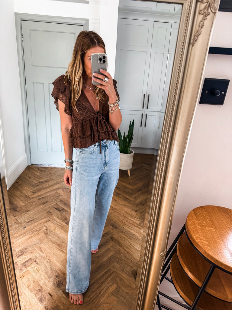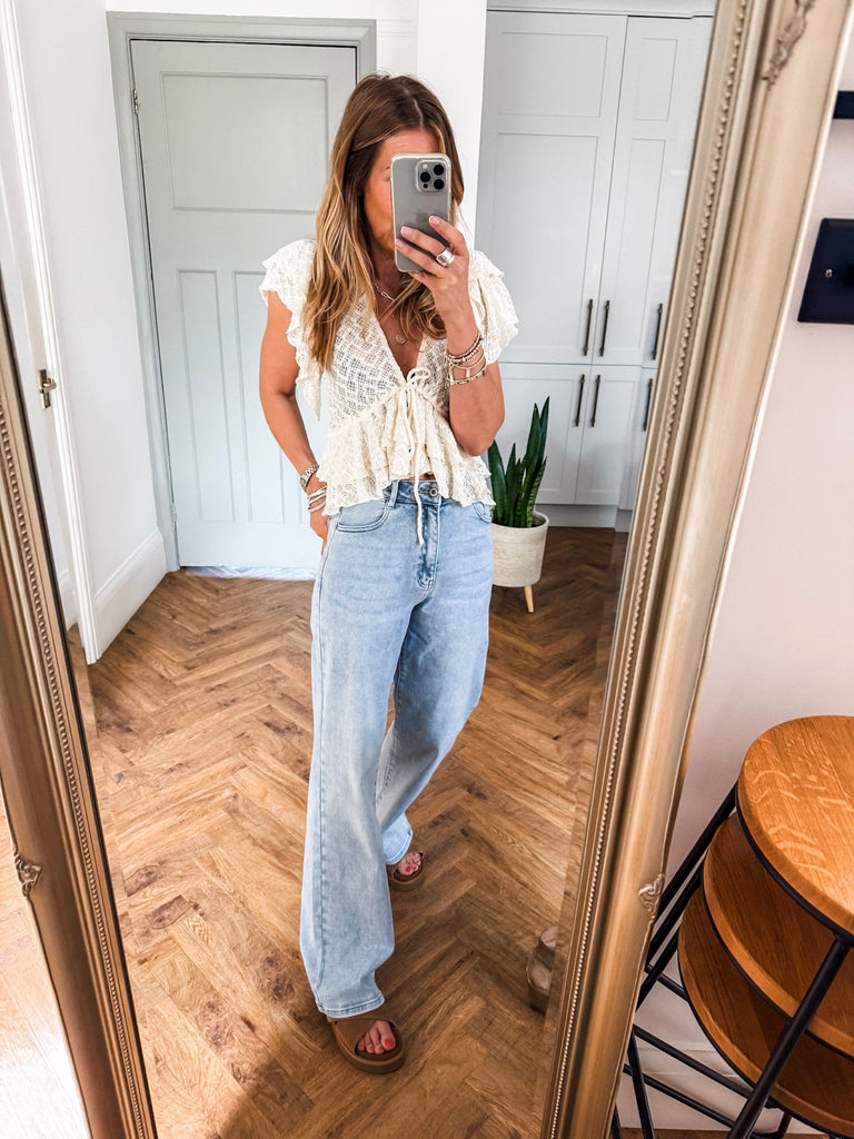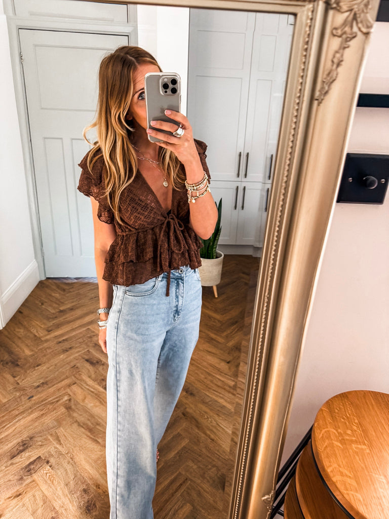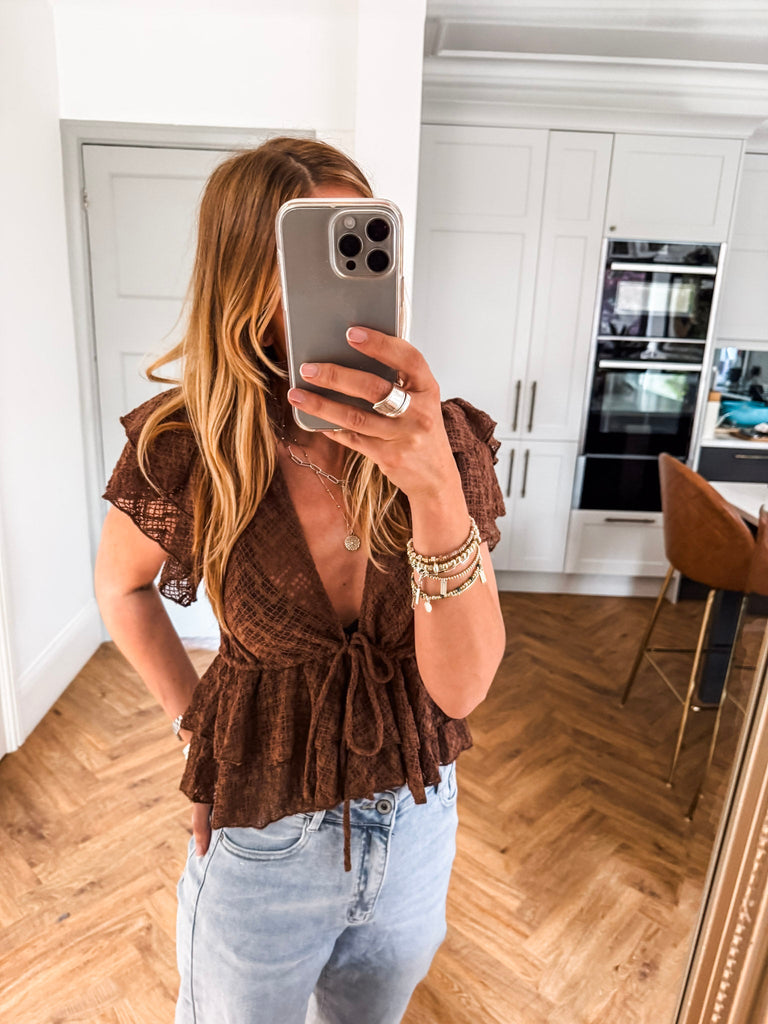 This Lace Frill Tie Top blends delicate lace with playful frill sleeves and hem for a fresh, feminine edge. The tie-front design lets you style it your way—chic and closed or relaxed and open. A versatile piece made for effortlessly cool looks.