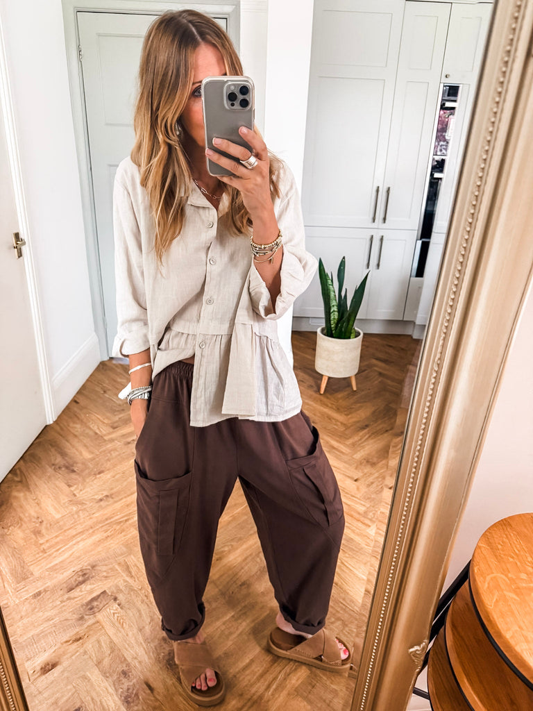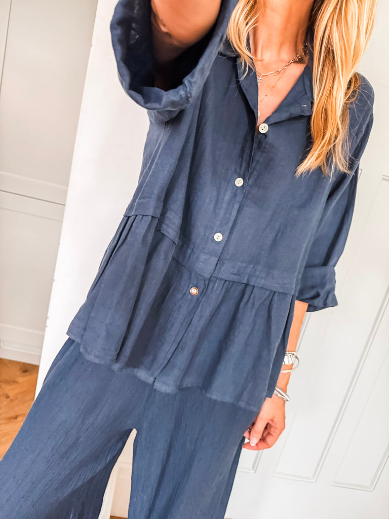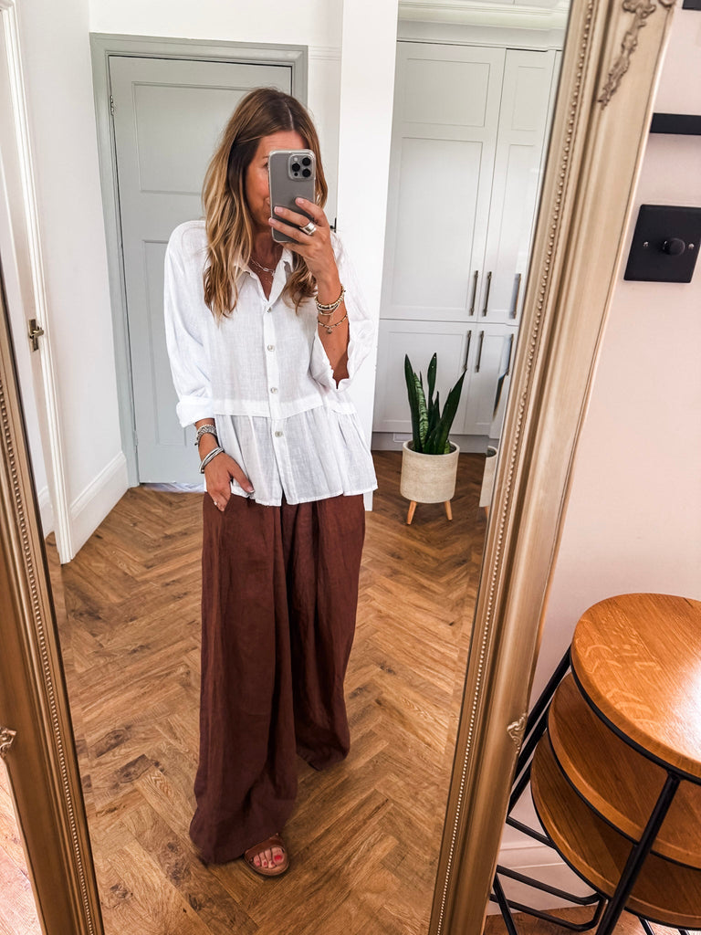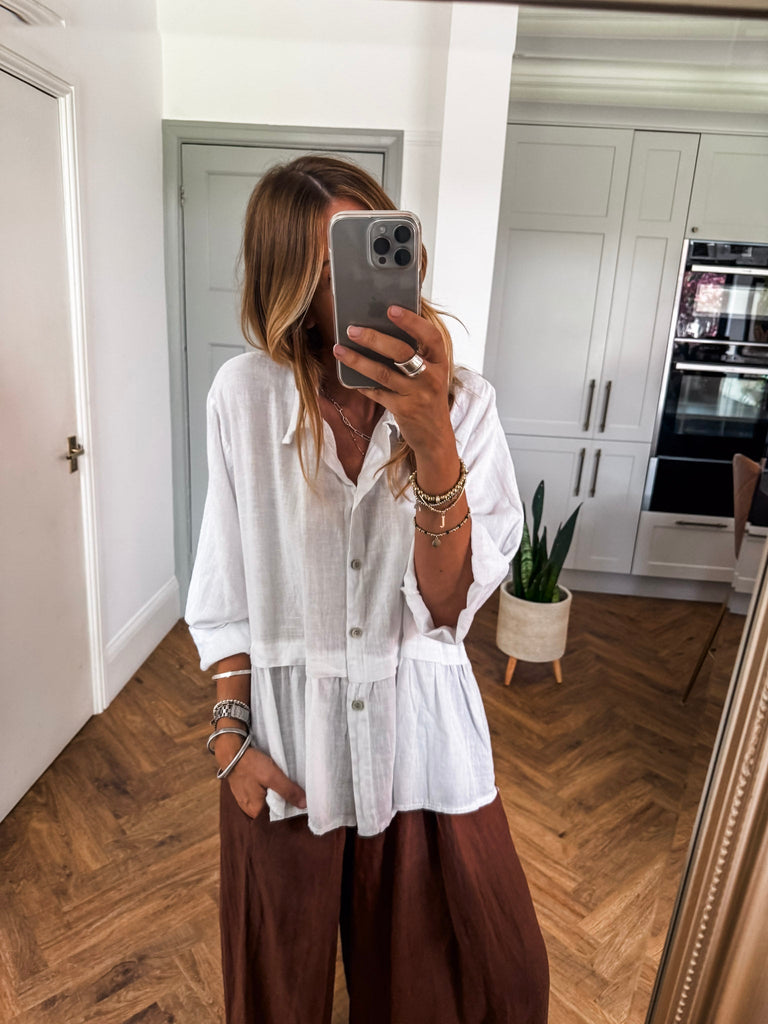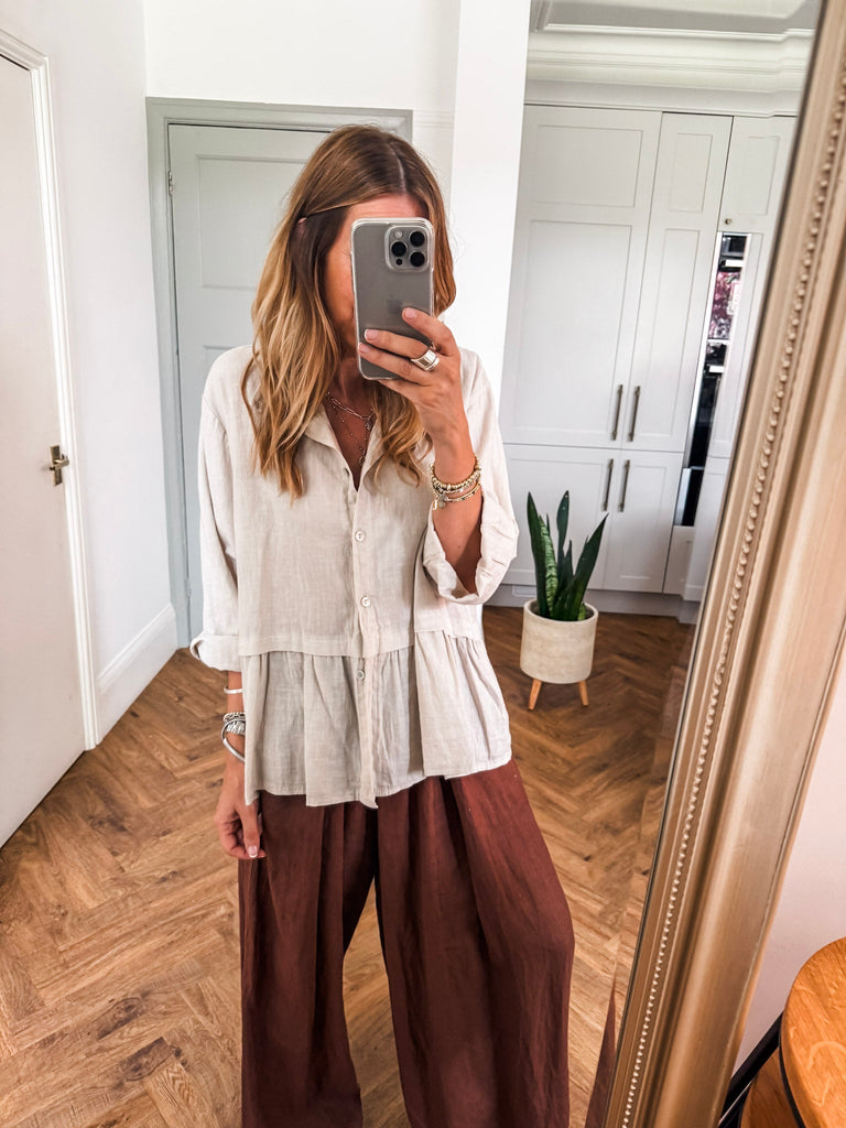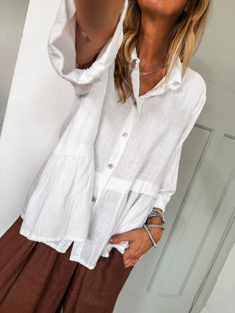 This linen frill shirt blends airy comfort with playful detail, featuring a frill hem, classic collar, and button-down front. Long sleeves make it perfect for layering or wearing solo across seasons. It’s an effortlessly cool staple with a soft, feminine twist.