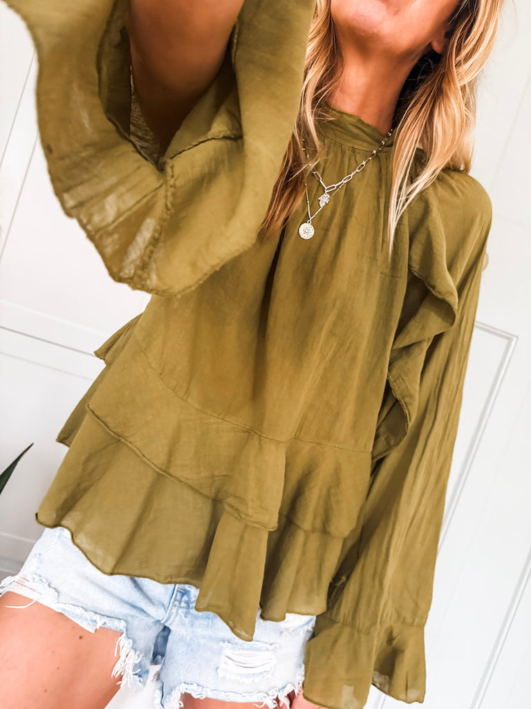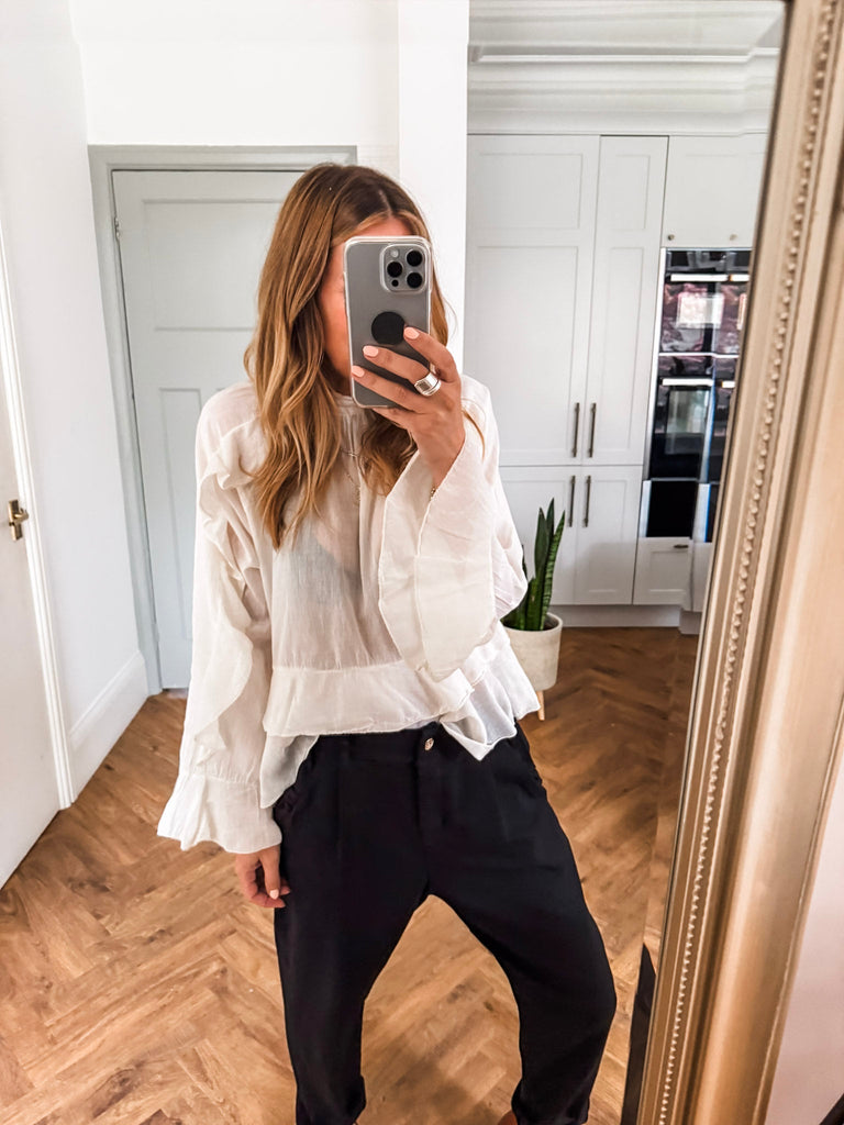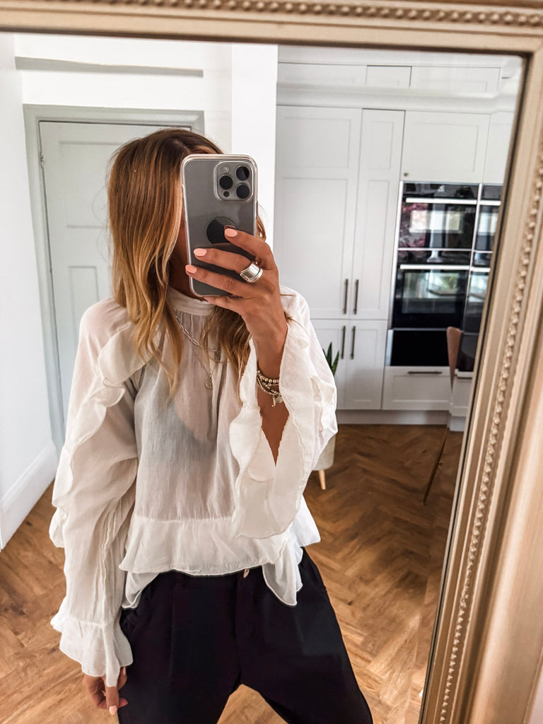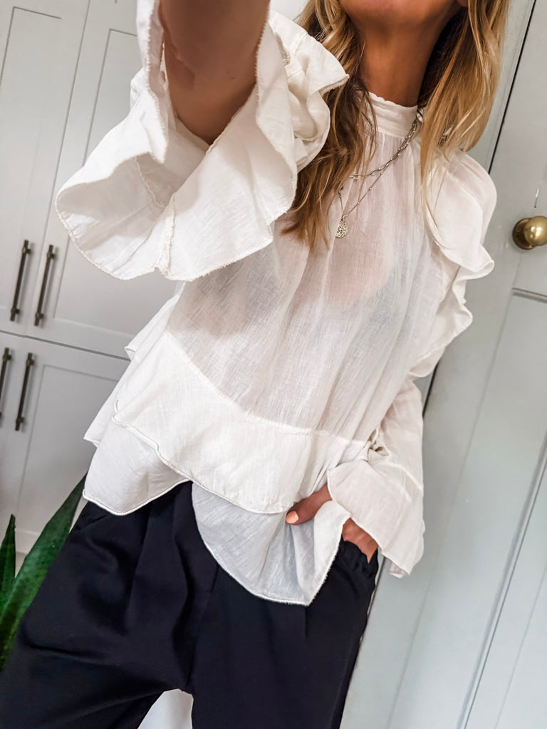 We love this blouse for its romantic, feminine details—the delicate frills, lightweight fabric, and high neckline create an effortlessly elegant look. Its sheer, flowy design adds a touch of softness and versatility, making it perfect for both casual days and dressier occasions.