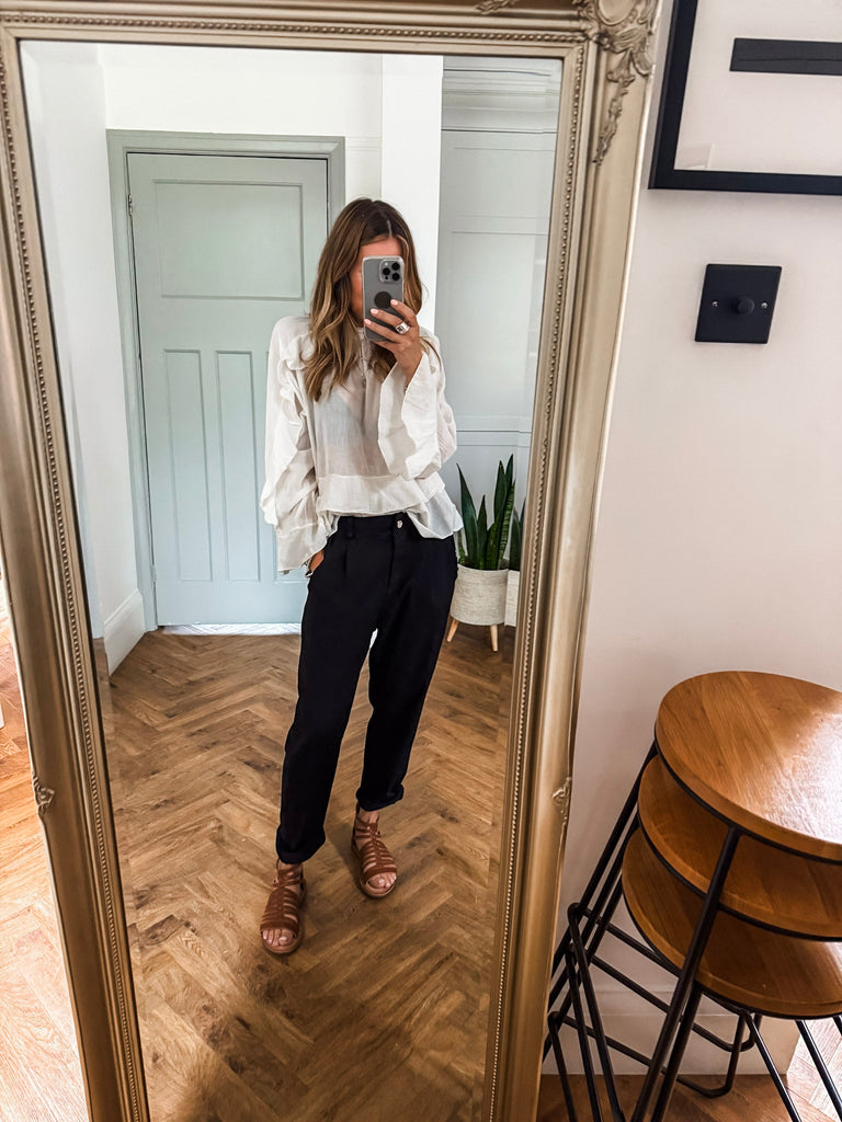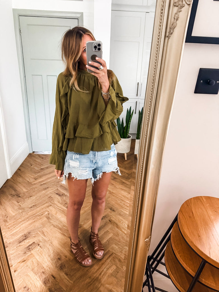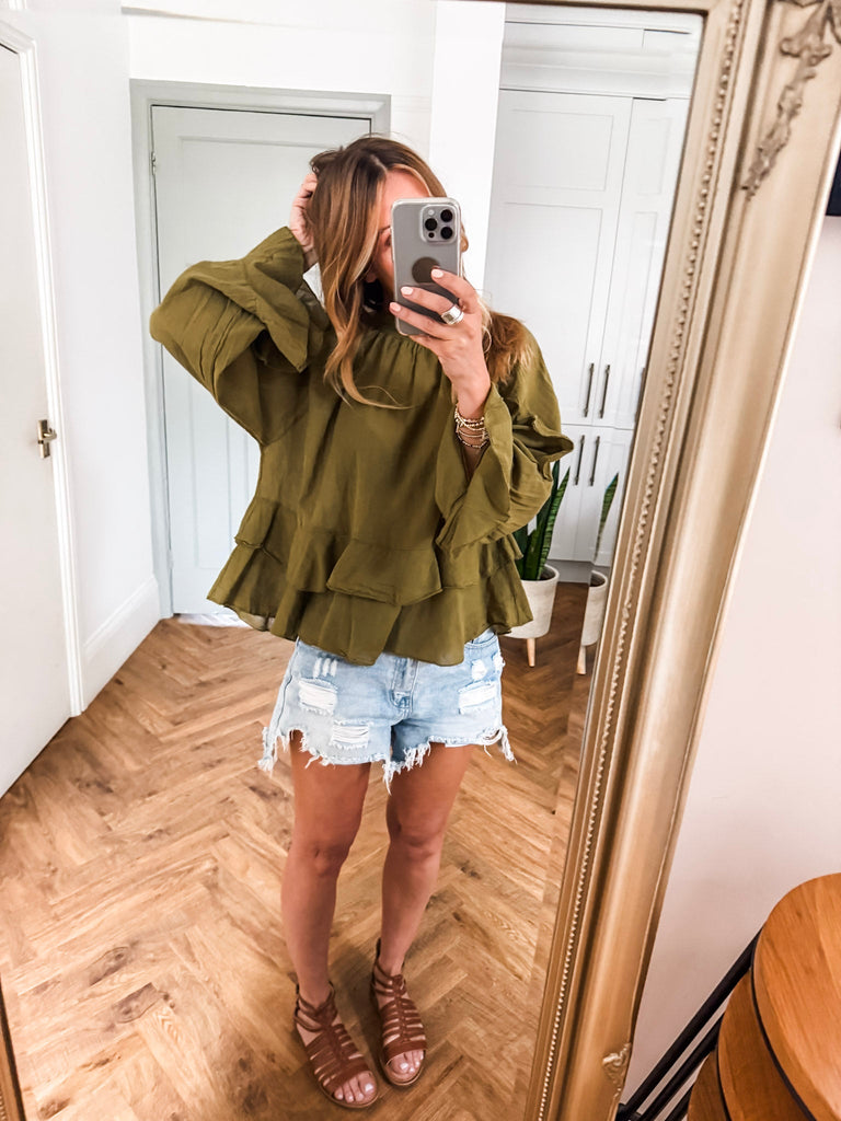 For a casual look, pair the lightweight, frilled blouse with Jeans or shorts and sandals, keeping accessories minimal with delicate jewelry and a crossbody bag. For a dressier outfit, tuck it into tailored trousers or a midi skirt, add heeled sandals or pumps. Finish the dressy look with a sleek blazer