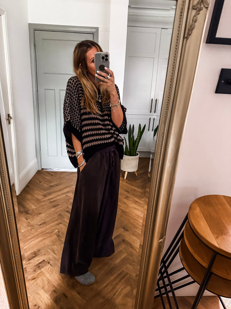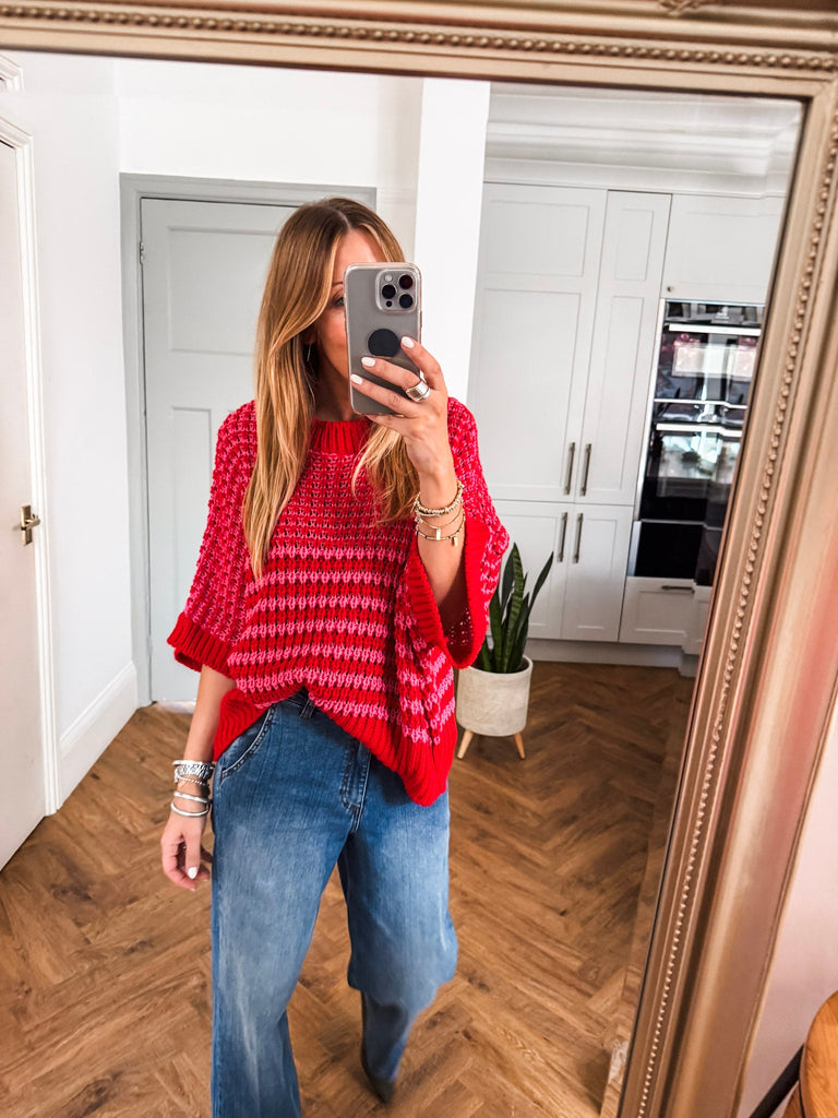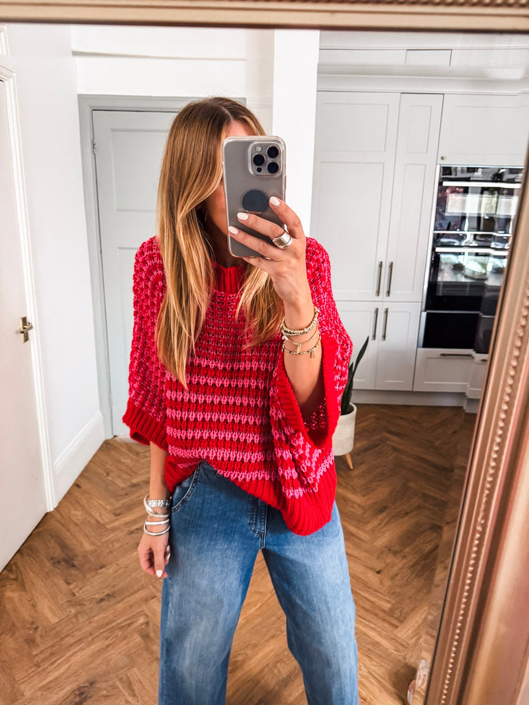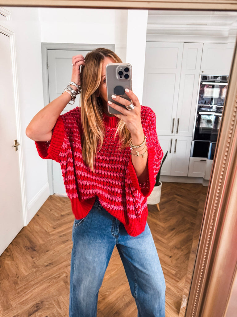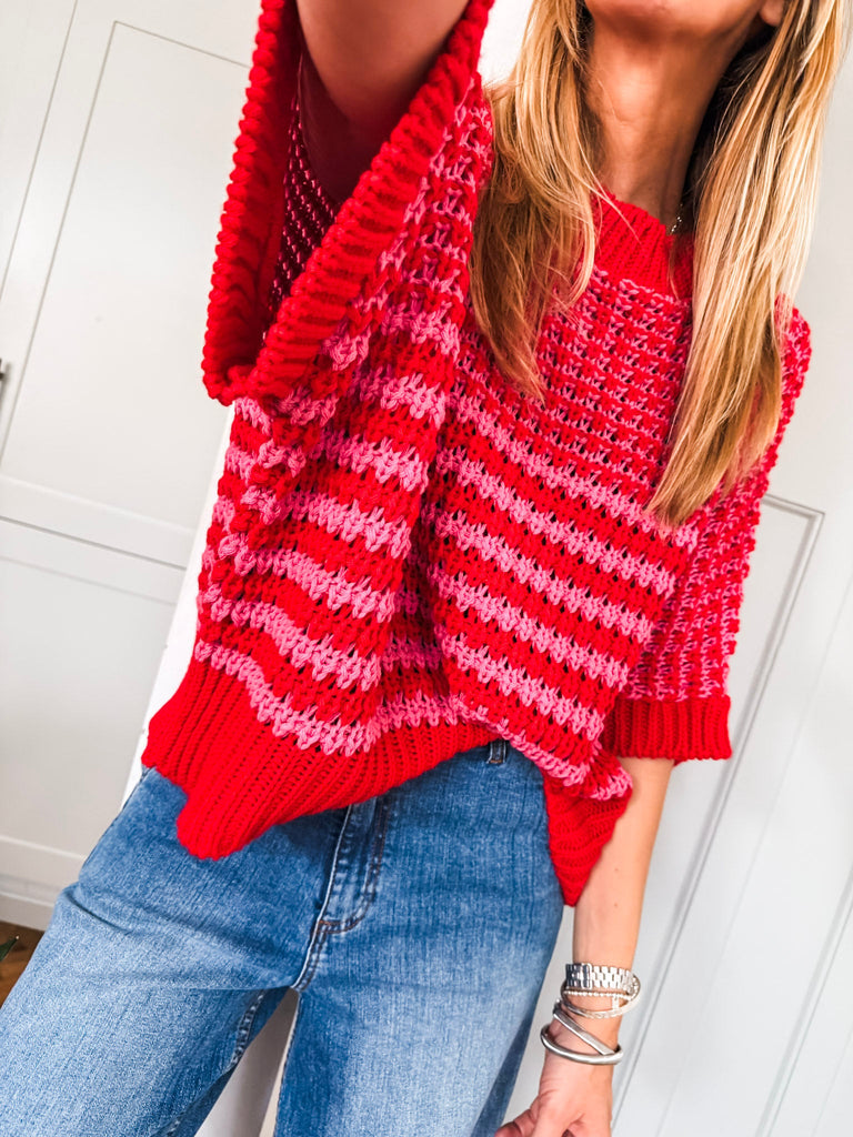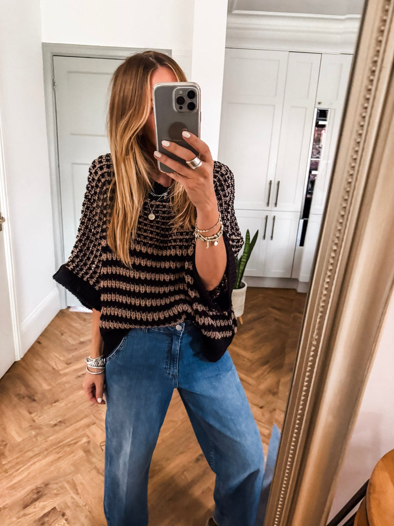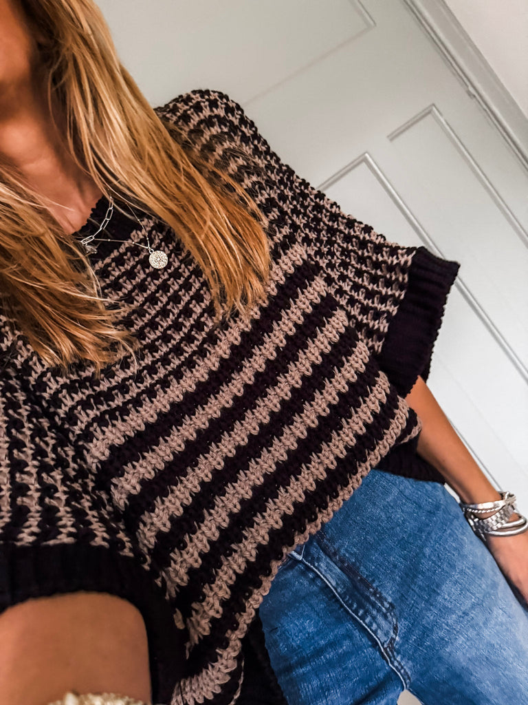 Stay effortlessly cool in the Two-Tone Chunky Knit Jumper, featuring bold stripes and unique cross-stitch detailing. With its relaxed fit and batwing sleeves, it’s all about comfort with a stylish edge. Perfect for layering or making a statement on its own.