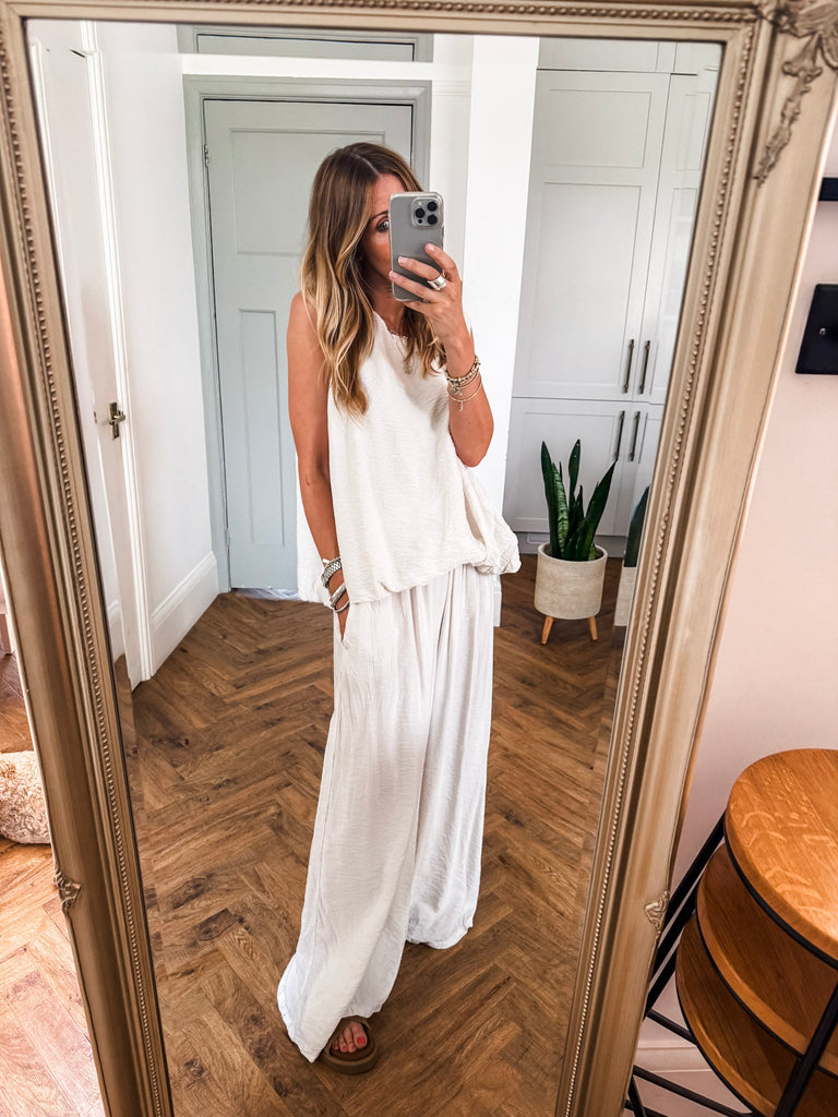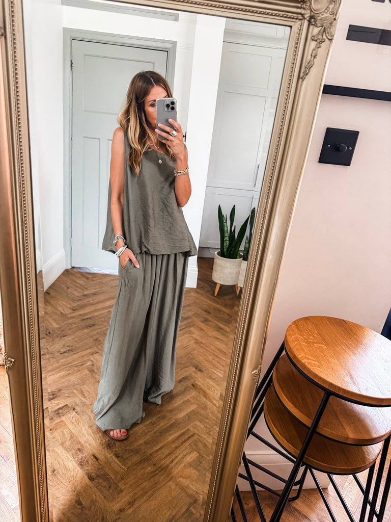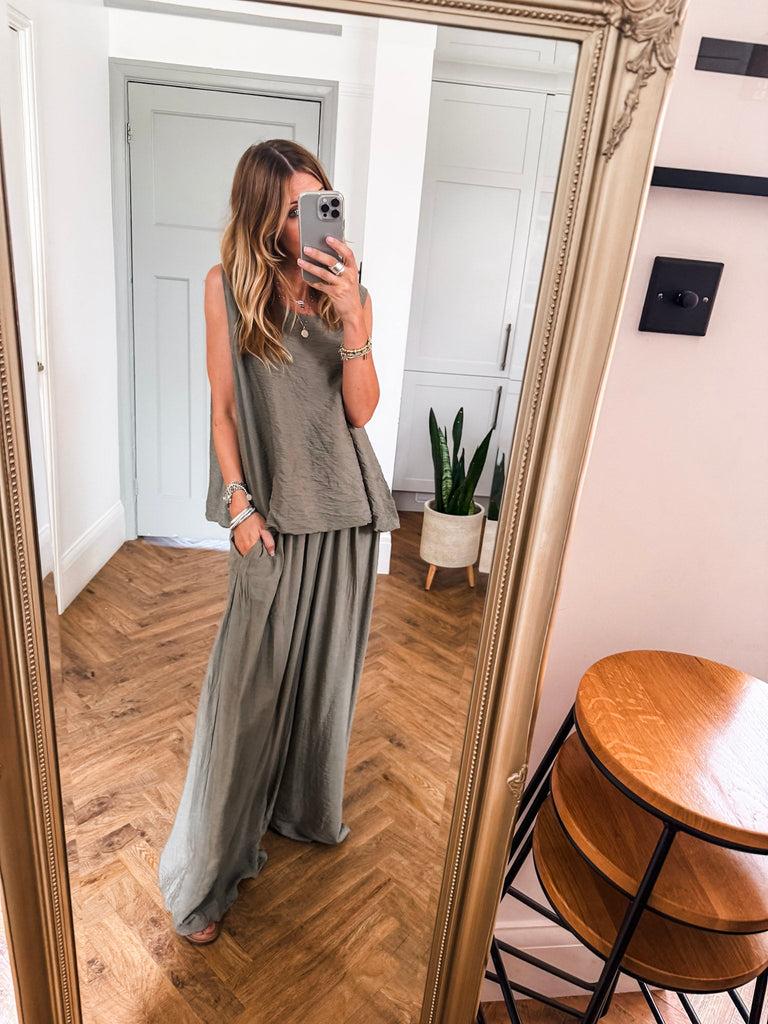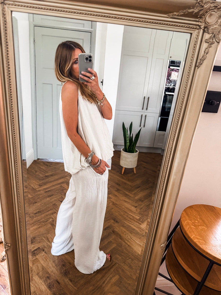 Stay effortlessly cool in these Crinkle Wide Leg Trousers—relaxed, flattering, and made to move with you. An elasticated waist and pockets bring all-day comfort and ease. The crinkle texture adds just the right touch of laid-back edge, perfect for dressing up or down. Matching top available!!