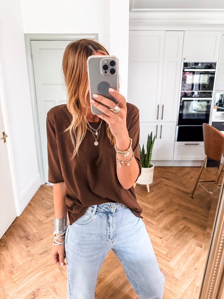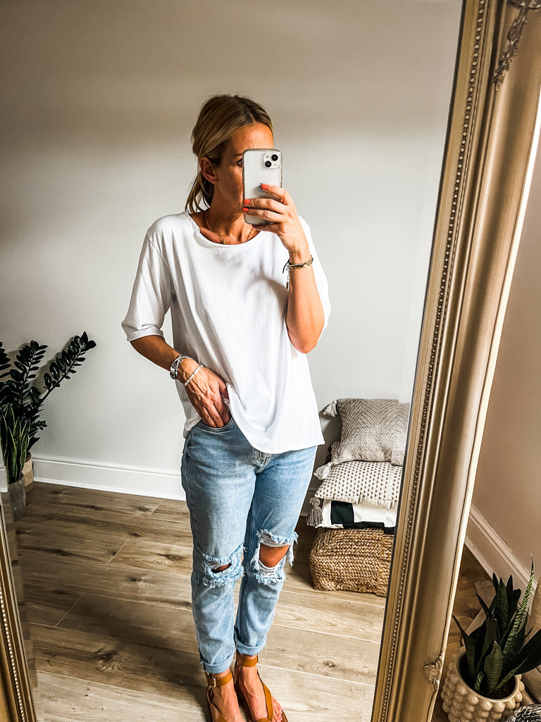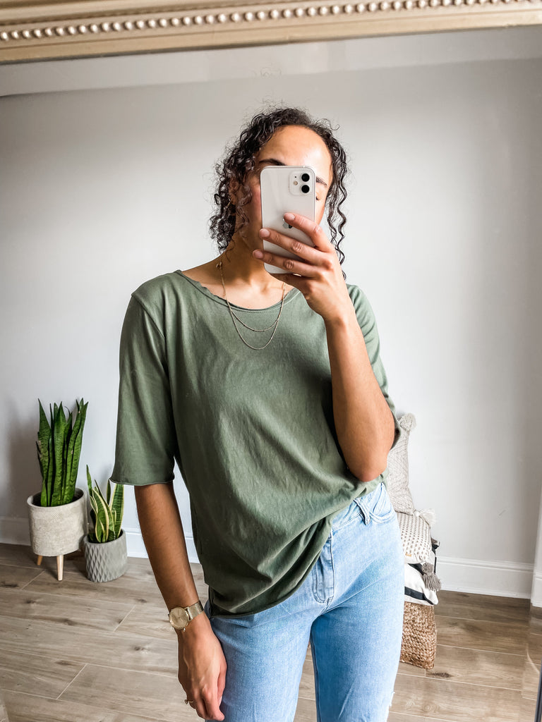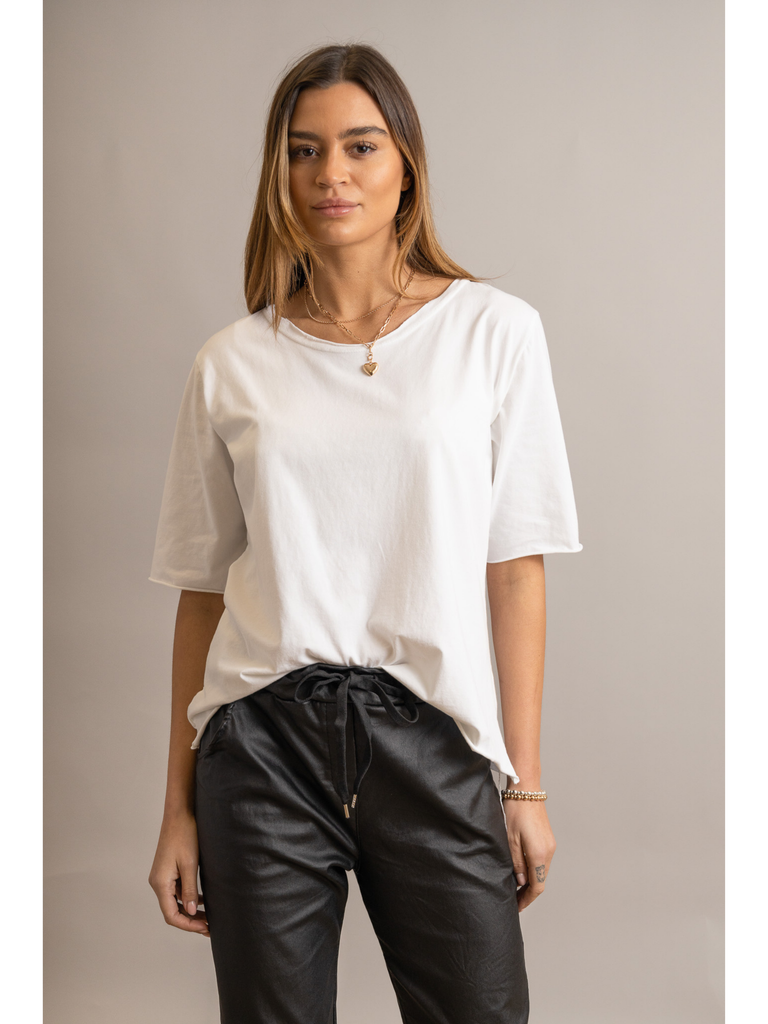 A t-shirt that is perfect in every way, this is a staple that your wardrobe needs! With a flattering round neck and short sleeves that you can wear rolled up. The soft cotton material wears well so this can be worn time and time again. Perfect all year round, with shorts and sandals in the summer and layered with leggings and cardigans in the winter.