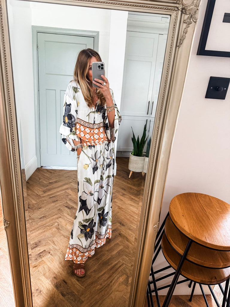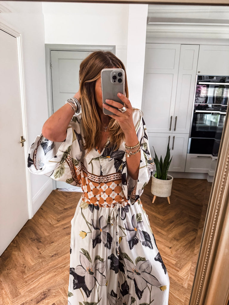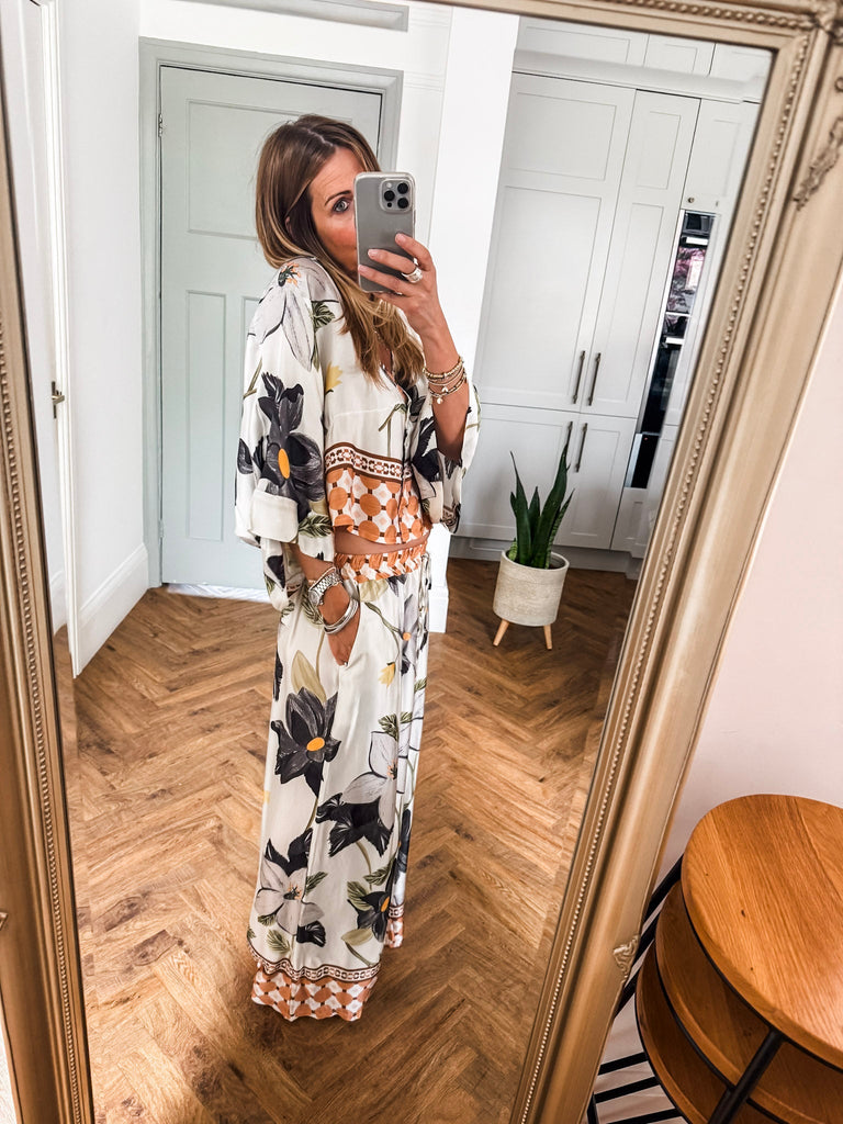 This Floral & Geometric Print Cropped Blouse blends vintage charm with modern edge in smooth satin. Featuring 3/4 sleeves and a button-up front, it strikes the perfect balance between relaxed and polished. A stylish essential that adds effortless flair to any outfit. Matching trousers available!!
